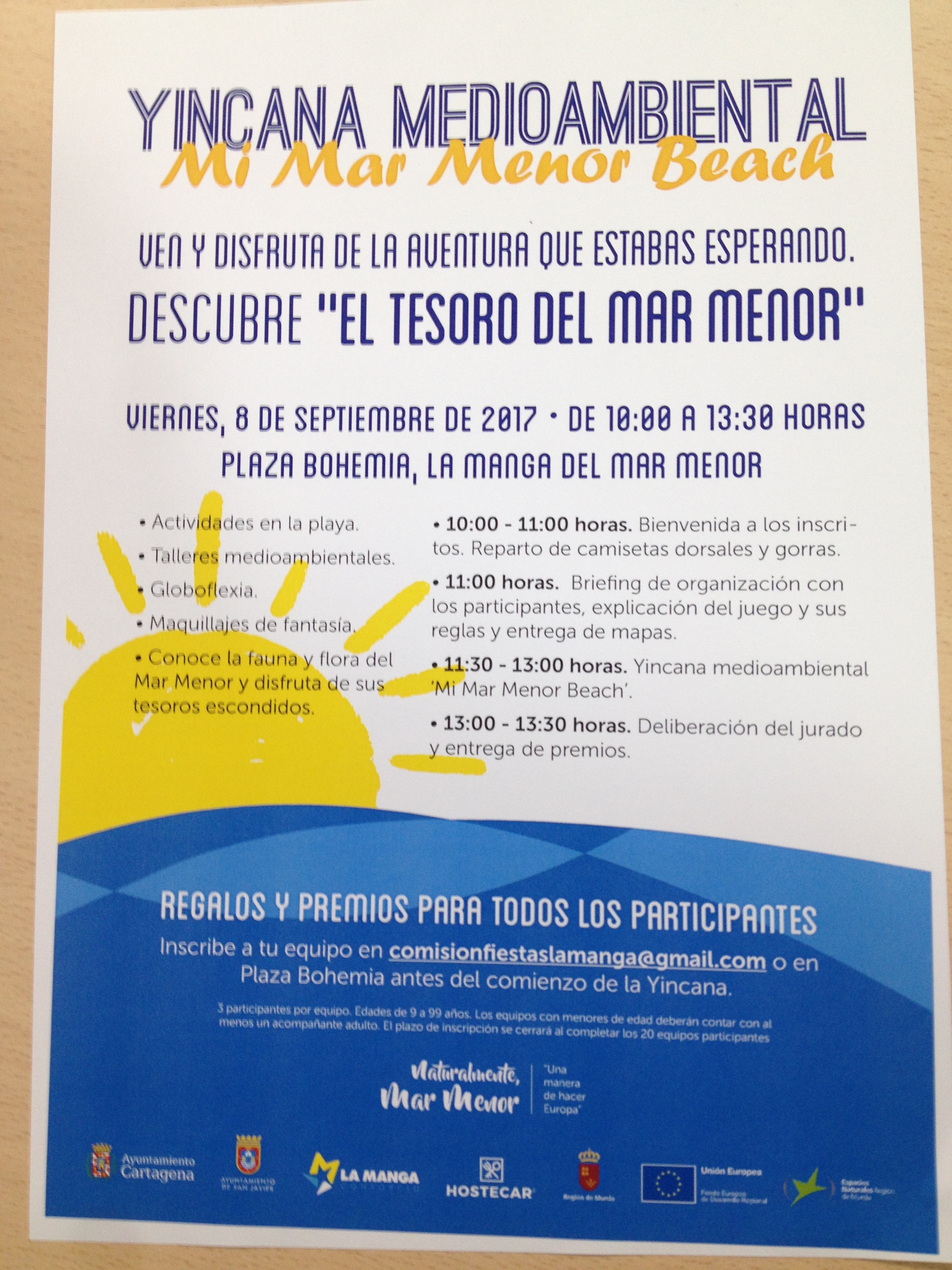 'Yincana Medioambiental Mi Mar Menor', una actividad que permitirá a los participantes a través de distintas pruebas conocer mejor la flora y la Fauna de este enclave natural privilegiado. Será el viernes a partir de las 10:00 horas, y para participar se debe formar un equipo de 3 personas de cualquier edad que deberán incribirse gratuítamente en la dirección de correo electrónico