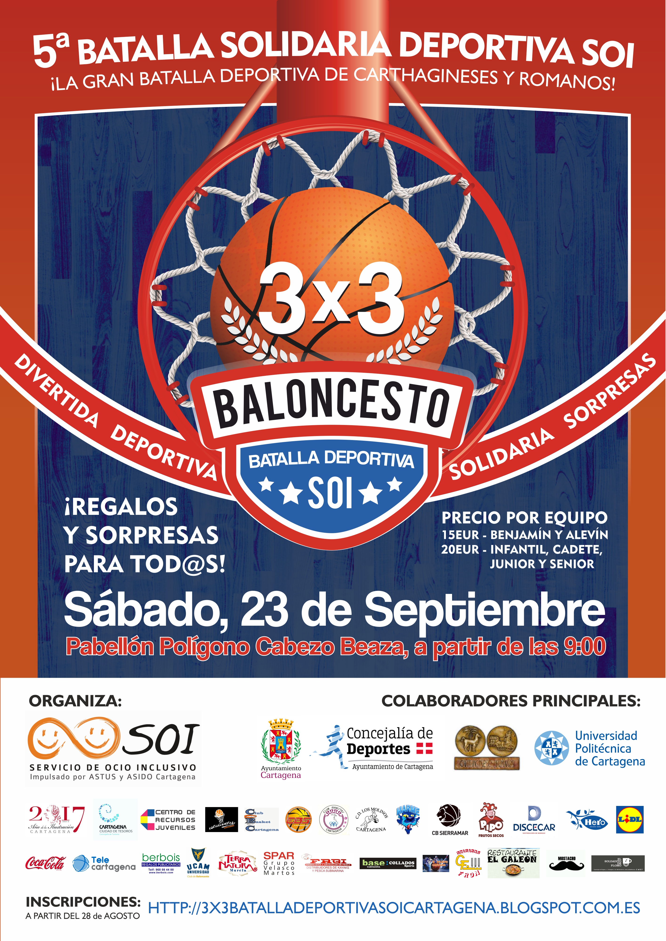 La Fundación Servicio de Ocio Inclusivo (SOI), en colaboración con la Concejalía de Deportes del Ayuntamiento de Cartagena, organiza la V Batalla Solidaria deportiva de las Fiestas de Carthagineses y Romanos: Torneo 3x3 de baloncesto. Un evento divertido, deportivo y solidario que se celebrará el sábado 23 de septiembre a partir de las 9:00 horas en el pabellón polideportivo del Polígono Cabezo Beaza.