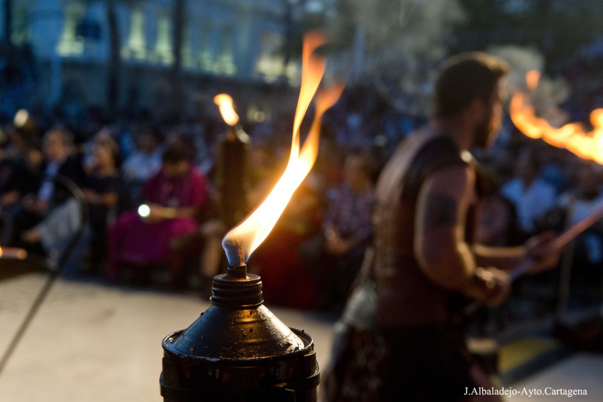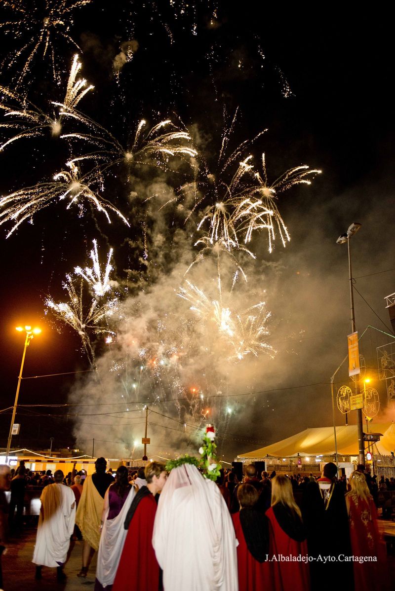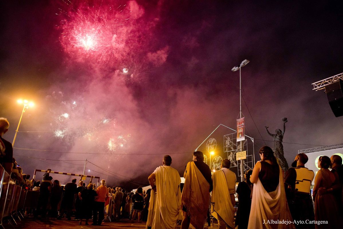 la XXVIII edición de las Fiestas de Carthagineses y Romanos se clausuró anoche con la ceremonia de Apagado del Fuego Sagrado y un gran castillo de fuegos artificiales que iluminó el cielo de Cartagena con sus brillantes y coloridas formas.