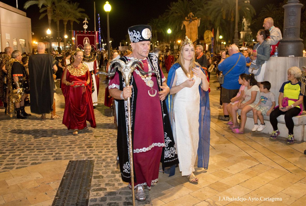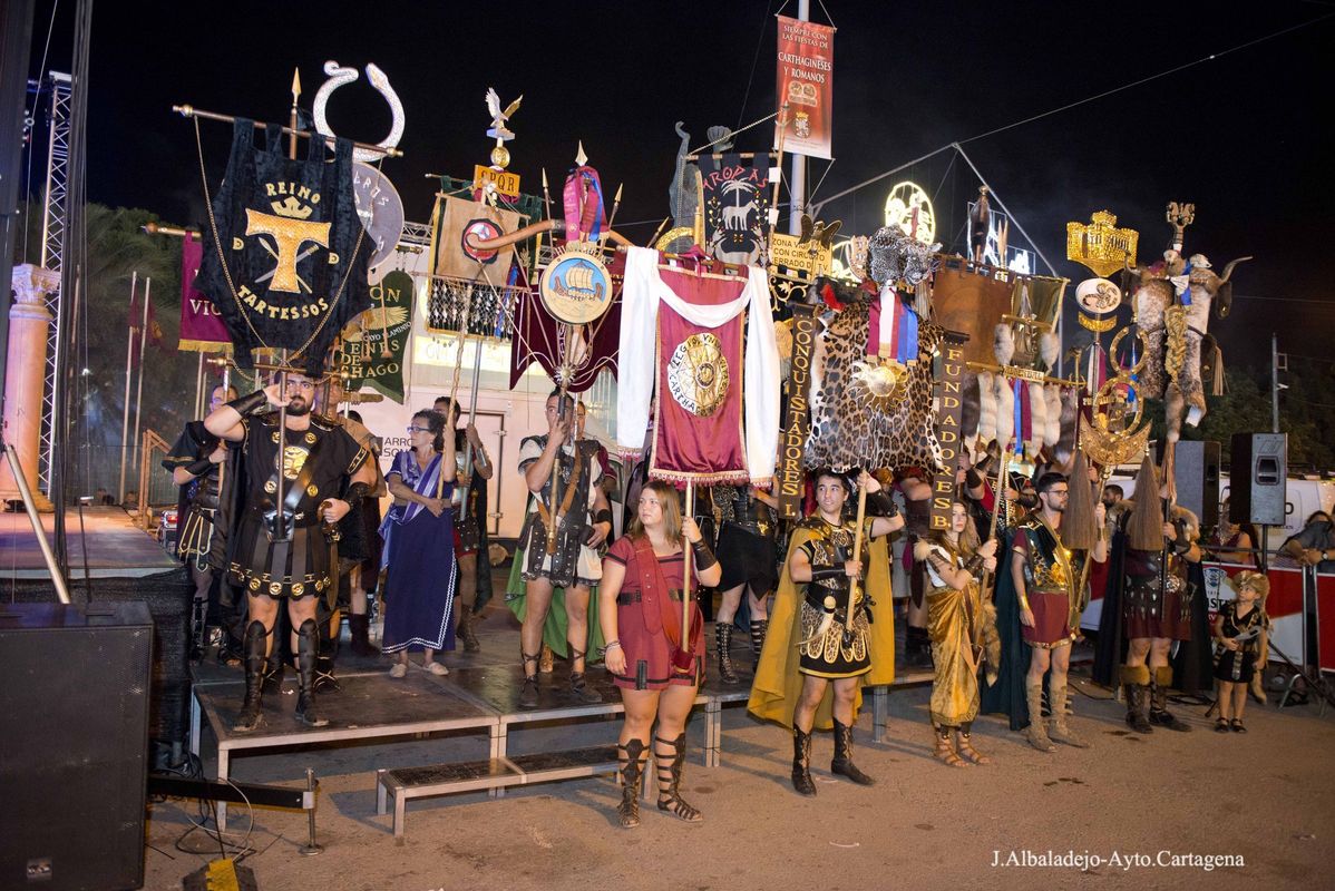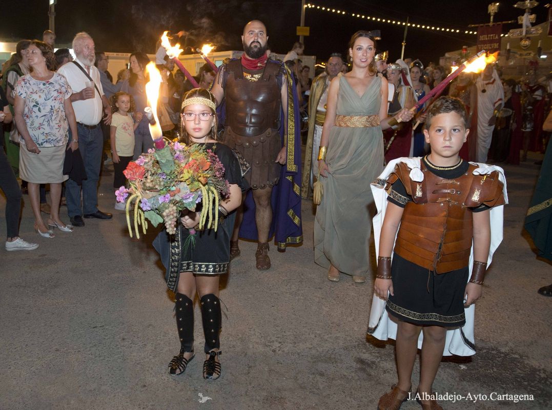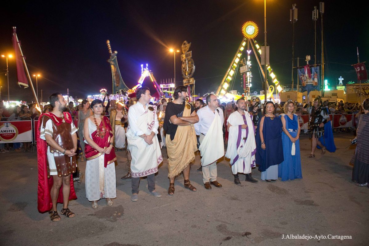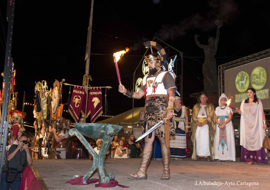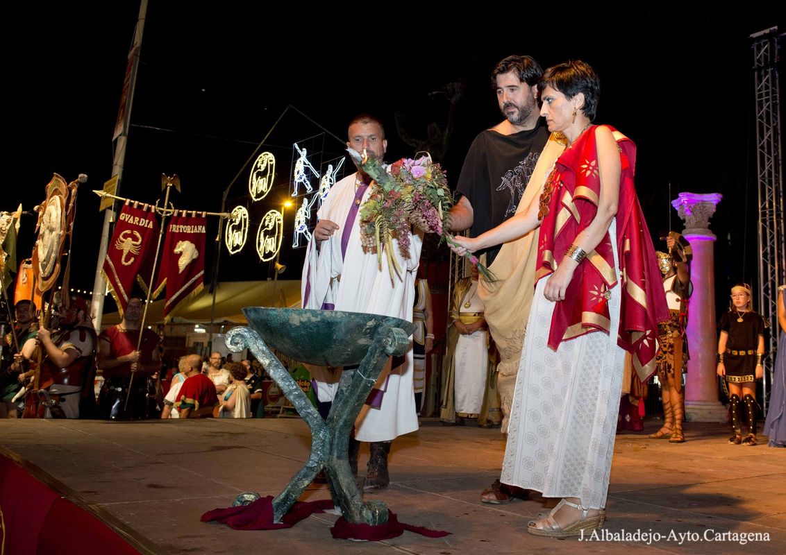 La ceremonia se inició con el desfile del fuego sagrado, que portaban un niño y una niña, seguidos de Aníbal e Himilce, Escipión y Emilia Paula, los cuatro con antorchas, y los estandartes de las 50 tropas y legiones. Tras su llegada al escenario se procedió al apagado del fuego en un pebetero lleno de agua, primero los generales y sus mujeres, y finalmente el presidente de la Federación de Tropas y Legiones junto a los presidentes de Consejo y Senado, procedieron al apagado de la antorcha del Fuego Sagrado. Tras el apagado el presidente de la Federación, José Antonio Meca, agradeció el gran esfuerzo de todos los festeros por conseguir el mejor resultado en la primera edición Carthagineses y Romanos como fiesta de Interés Turístico Internacional. A continuación el alcalde en funciones, Juan Pedro Torralba, tuvo unas palabras de agradecimiento y felicitación para Policía Local, Bomberos y Brigadas Municipales, por su esfuerzo y buen hacer para que estas fiestas se desarrollaran sin incidencias.