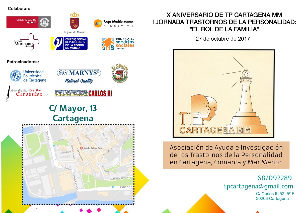 La Asociación de Ayuda e Investigación de los Trastornos de la Personalidad en Cartagena, Comarca y Mar Menor (TP Cartagena MM) celebrará esta jornada el viernes 27 de octubre en el Aula Cultural de la Fundación Caja Mediterráneo, con la colaboración del Ayuntamiento