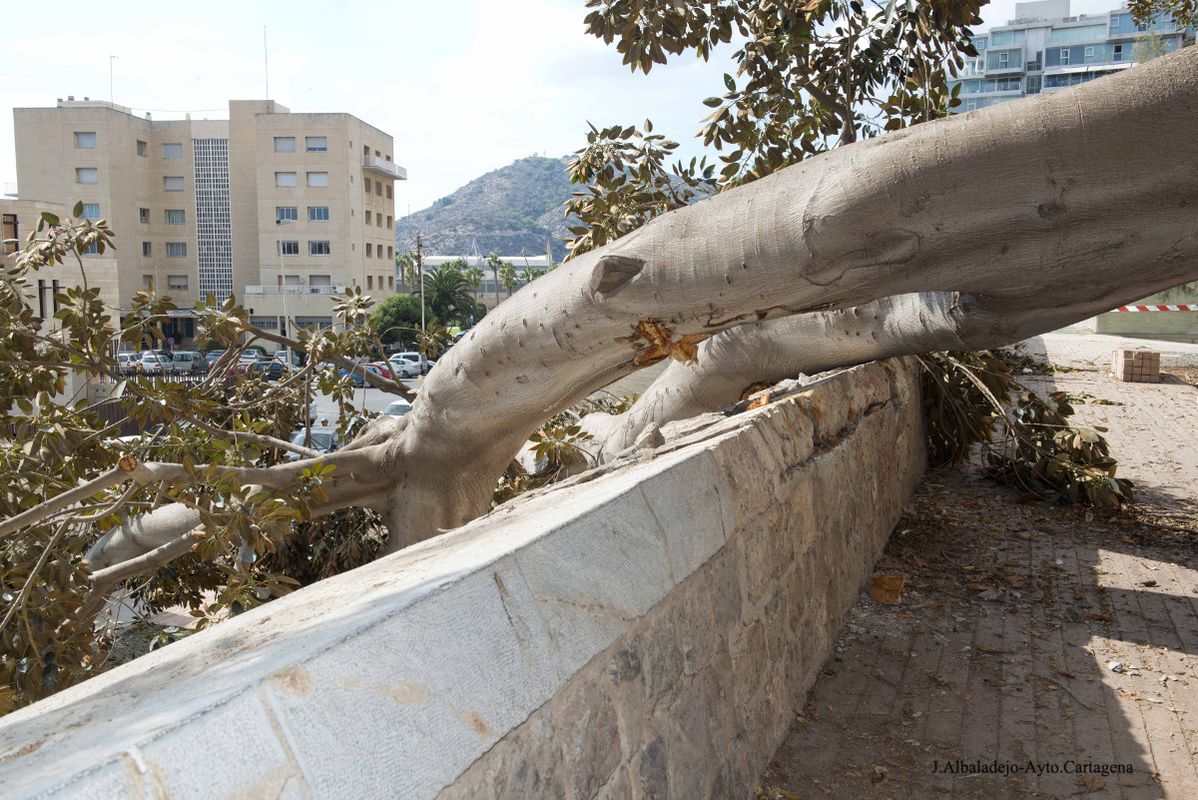 caída de una gran rama de 20.000 kg que el Servicio de Parques y Jardines de la Concejalía de Infraestructuras del Ayuntamiento de Cartagena retiró tras su correspondiente estudio de daños.