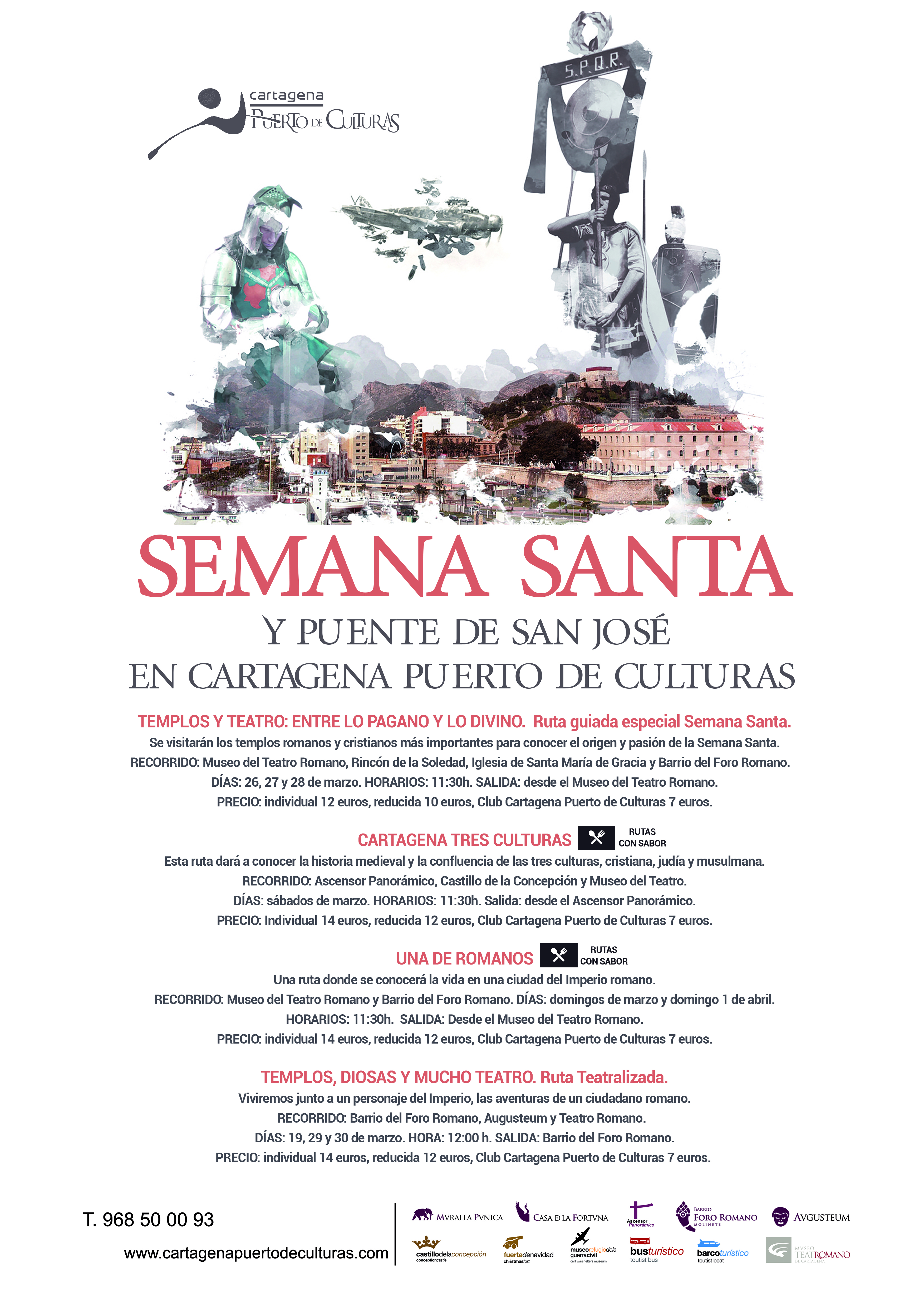 Recorrido: Museo del Teatro Romano y Barrio del Foro Romano. Días: domingos marzo y domingo 1 de abril. Horarios: 11:30h. Salida: desde el Museo del Teatro Romano. Precio: individual 14 euros, reducida 12 euros, Club Cartagena Puerto de Culturas 7 euros.