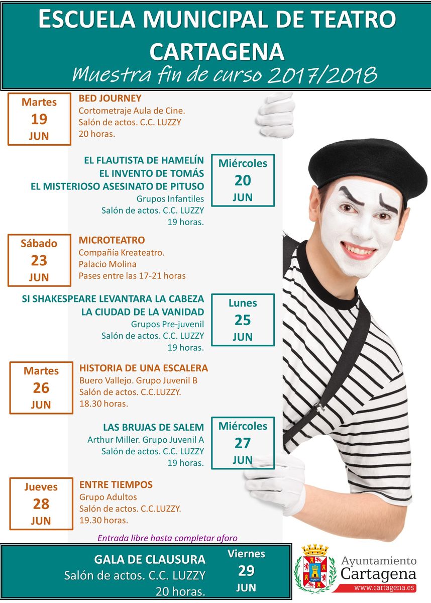 muestra de Fin de Curso del martes 19 al viernes 29 de junio, en la que se sucederán las actuaciones de los diferentes grupos que han participado en la escuela de teatro, en total
