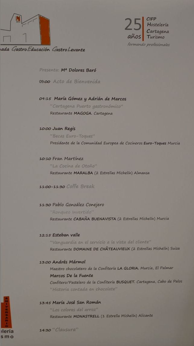 La cocinera televisiva, María Dolores Baró, será la encargada de presentar esta jornada culinaria, a las 9 horas, en un acto en la que está prevista la asistencia de la alcaldesa, Ana Belén Castejón, y el concejal de Turismo, David Martínez. A las 9:15 horas, los cocineros del Restaurante Magoga de Cartagena, María Gómez y Adrían de Marcos hablarán sobre 'Cartagena Puerto Gastronómico'. A las 10 horas, tendrá lugar una ponencia sobre las becas Euro-Toques, a cargo de su presidente, Juan Regis.