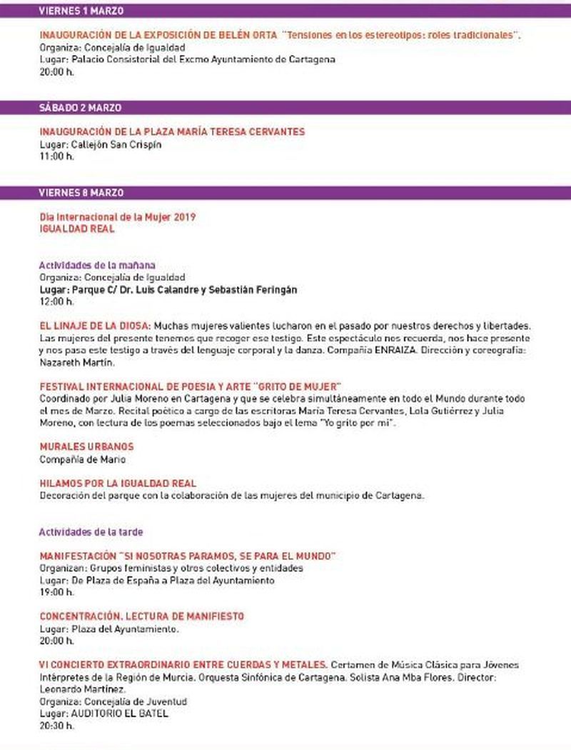 La exposición de Belén Orta, la inauguración de la plaza María Teresa Cervantes, el Festival Internacional de Poesía y Arte, la manifestación del Día Internacional de la Mujer, la sexta edición del Concierto Extraordinario Entre Cuerdas y Metales, un curso de defensa personal, la proyección de la película 'Figuras Ocultas' y la obra de teatro '8 mujeres', son algunas de las actividades que ha programado