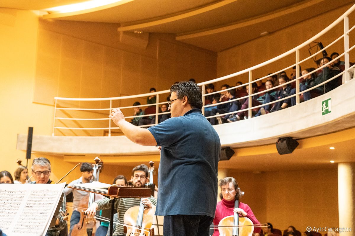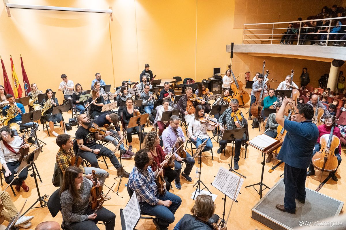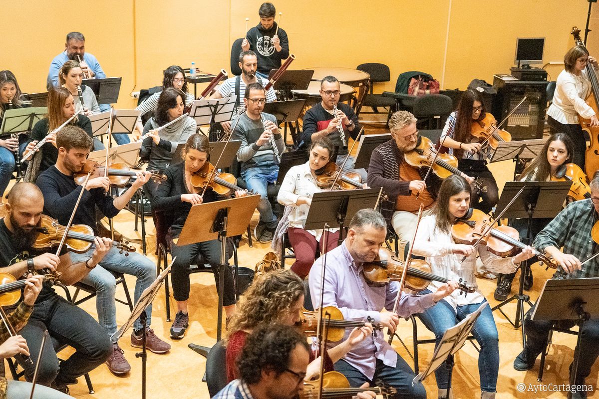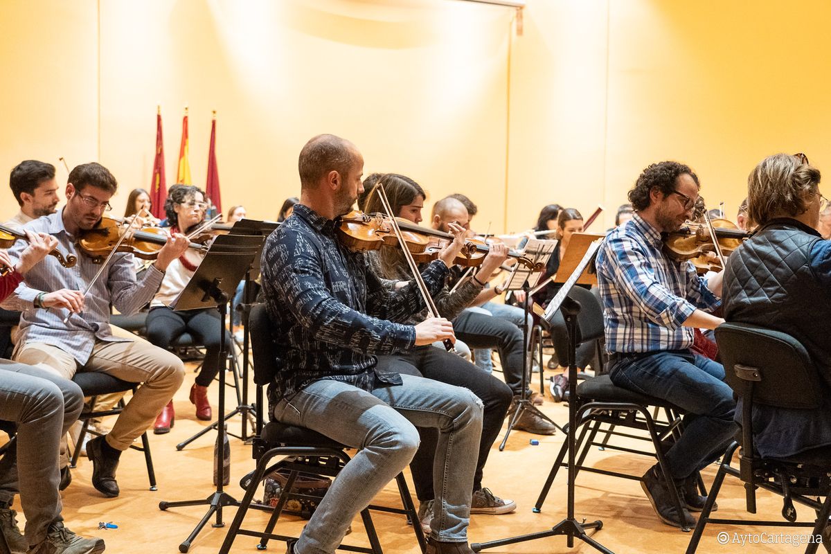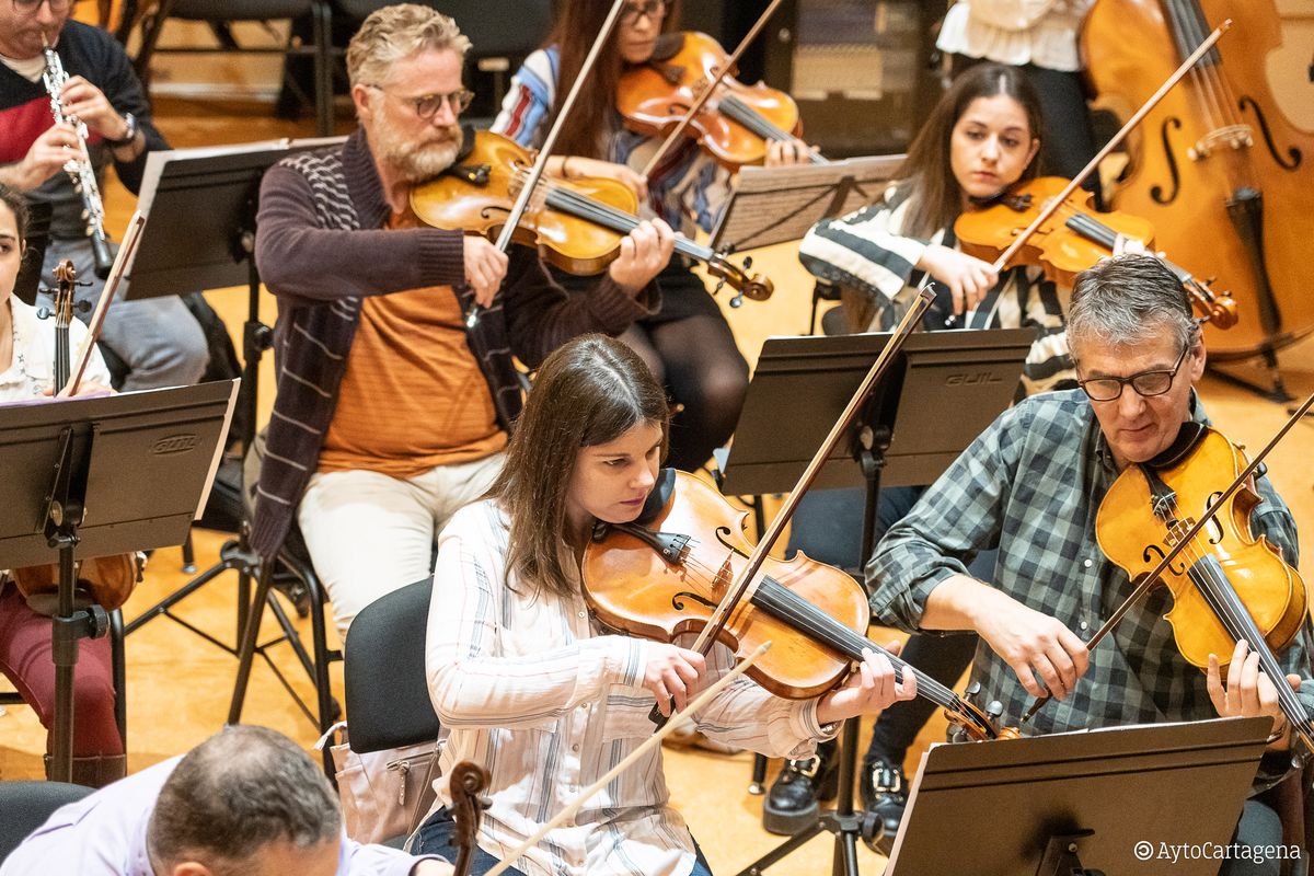 os músicos de la Orquesta Sinfónica de Cartagena, su director y la solista del concierto extraordinario trabajan para el montaje de las obras que se van a interpretar el viernes,