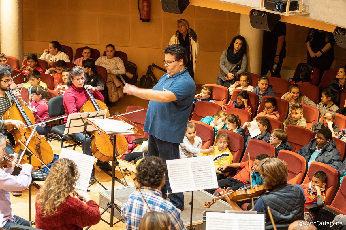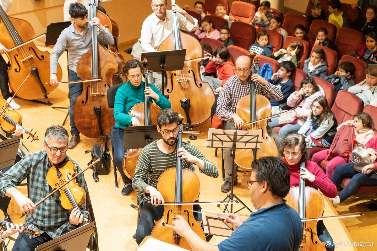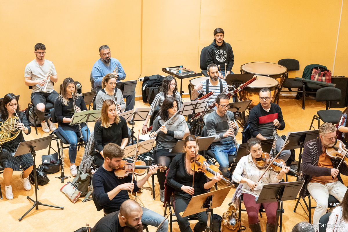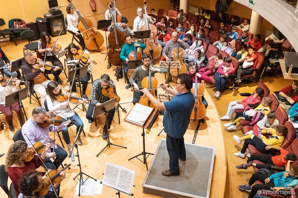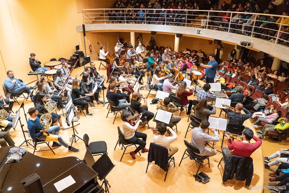 os músicos de la Orquesta Sinfónica de Cartagena, su director y la solista del concierto extraordinario trabajan para el montaje de las obras que se van a interpretar el viernes,