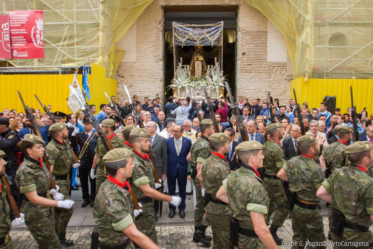 rostros de emoción, sobre todo al ser portados a hombros la Virgen y el titular, el Cristo Resucitado, hacia el exterior de Santa María, precedidos por la