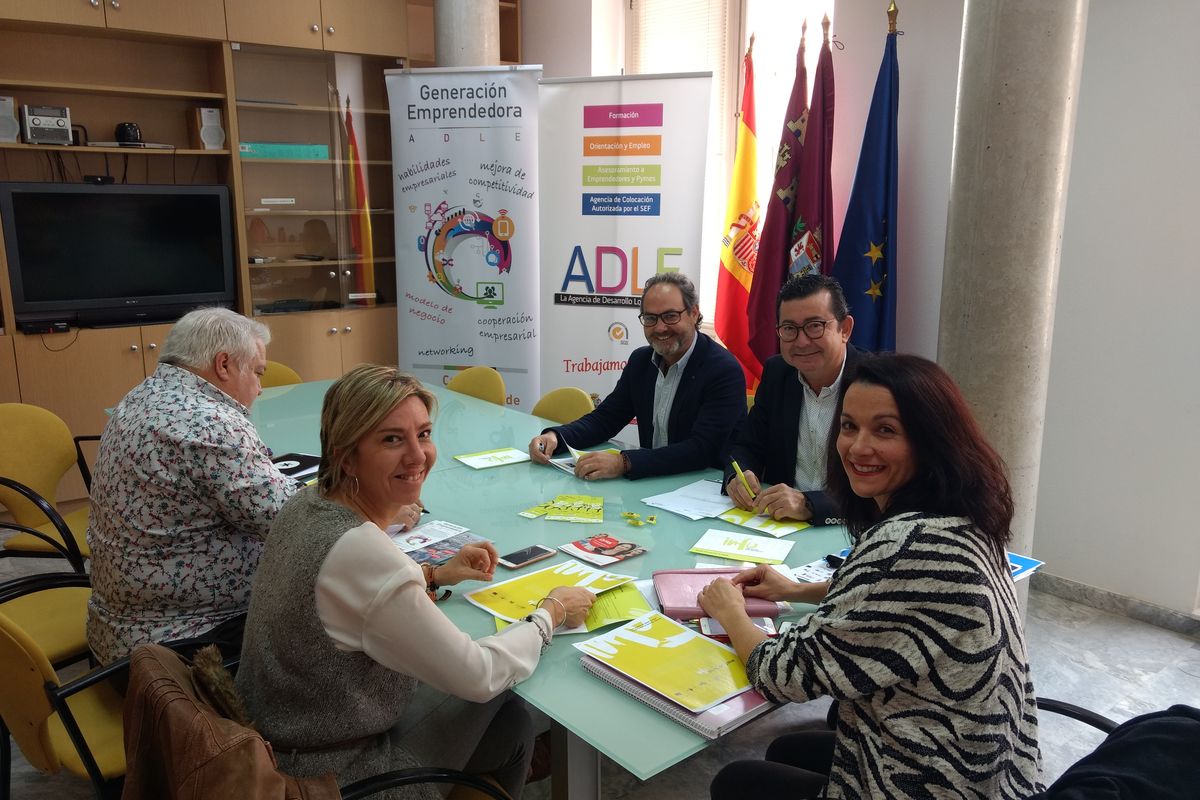 Irene Ruiz Roca; la Concejala Delegada de Empresas, Cristina Pérez Carrasco; el gerente de la ADLE, Fulgencio Luis Cerón Mora y los Técnicos del Departamento de Emprendimiento y Desarrollo Local, Rosa Sala y Miguel Ángel Gutiérrez.