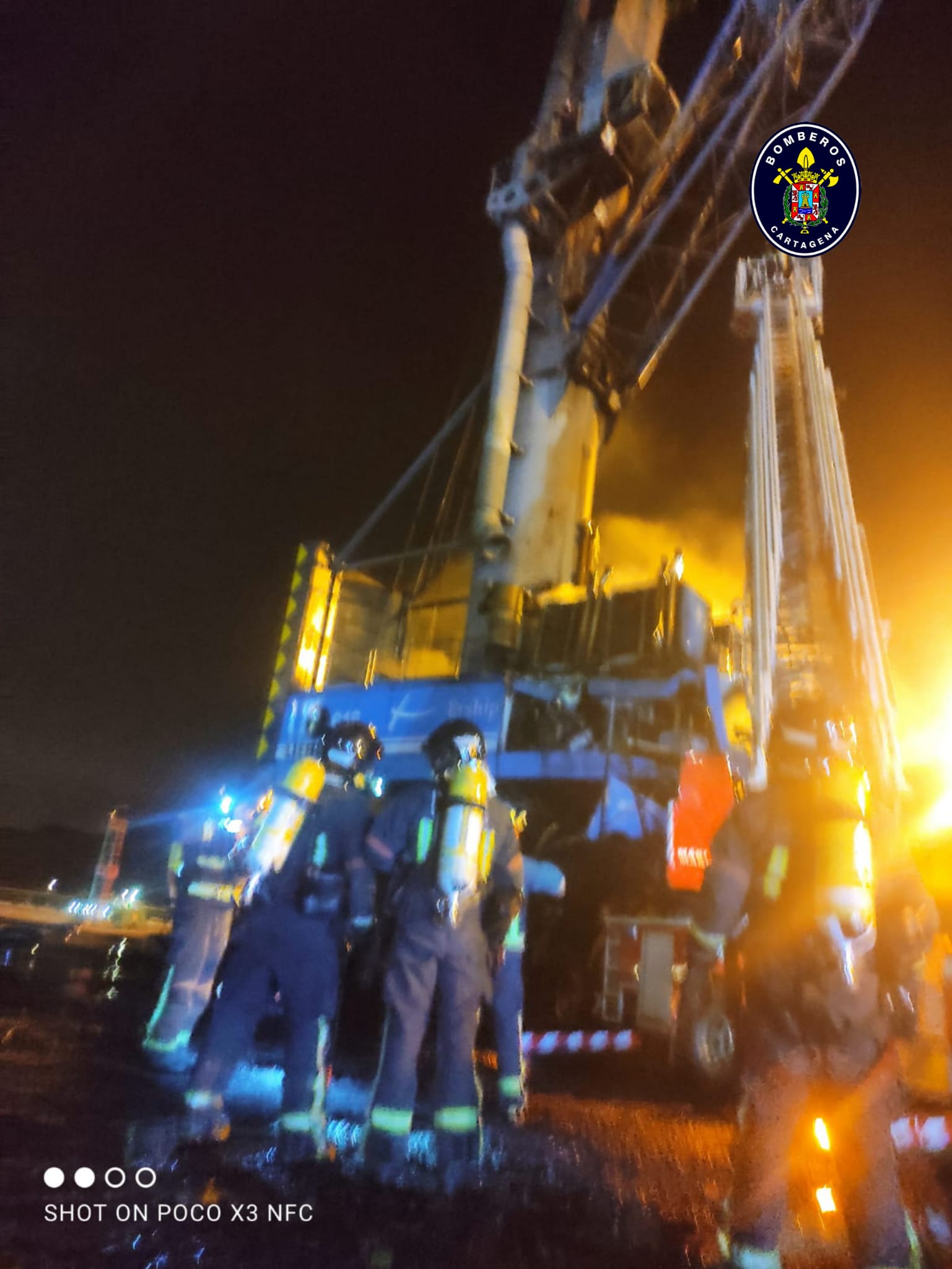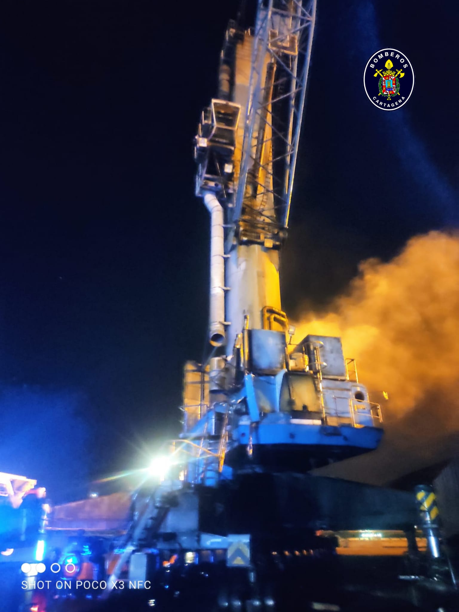 Bomberos del Servicio de Extinción de Incendios del Ayuntamiento de Cartagena trabajaron la noche de este martes, 4 de mayo, en las labores de extinción de un fuego originado en una grúa móvil situada en la dársena sur del muelle de Escombreras.