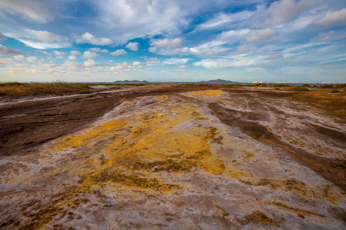 Los Nietos Pescadería: Un mar herido … por recuperar Cartel con 5 imágenes de los impactos mineros en los últimos tramos de la rambla Mendoza y en el Mar Menor.
