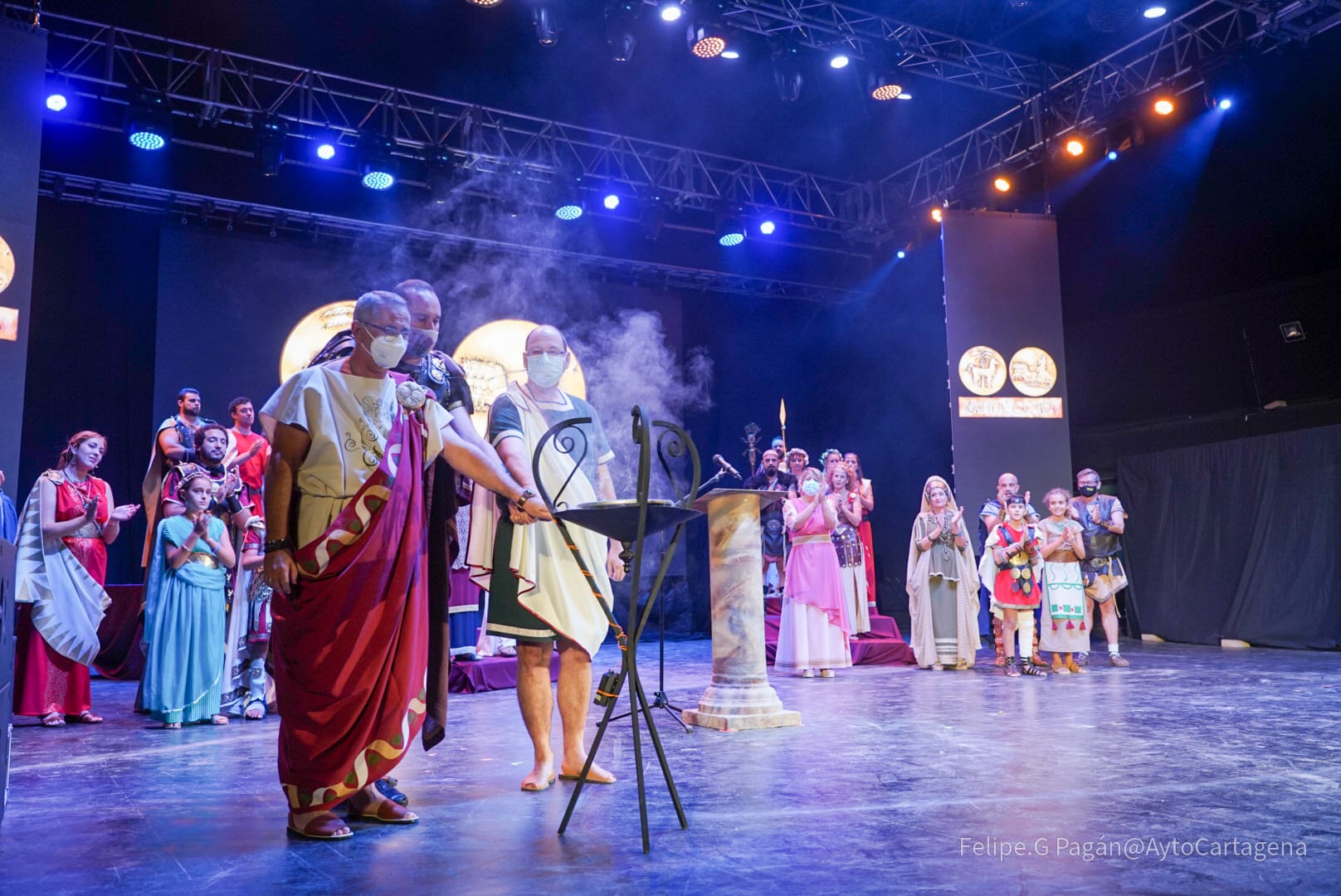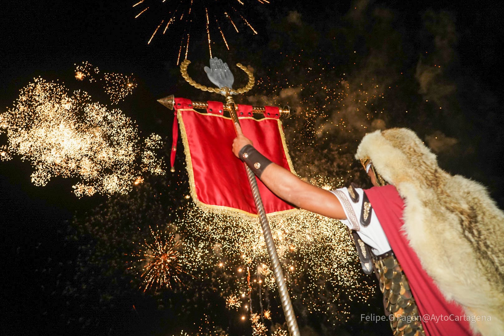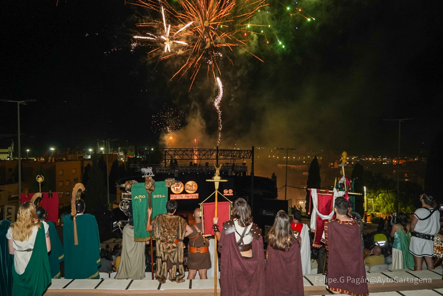 apagado del fuego sagrado y el castillo de fuegos artificiales. Los festeros escenificaron en el Auditorio Paco Martín del Parque Torres este ritual que cierra El año de la Esperanza de las fiestas históricas de Cartagena.