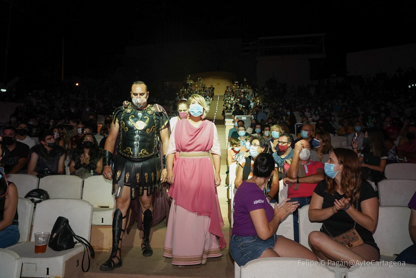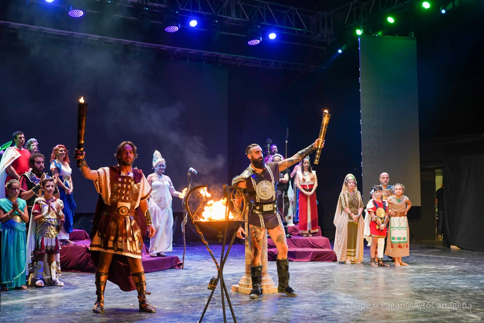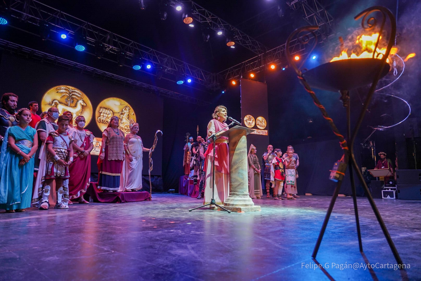 apagado del fuego sagrado y el castillo de fuegos artificiales. Los festeros escenificaron en el Auditorio Paco Martín del Parque Torres este ritual que cierra El año de la Esperanza de las fiestas históricas de Cartagena.