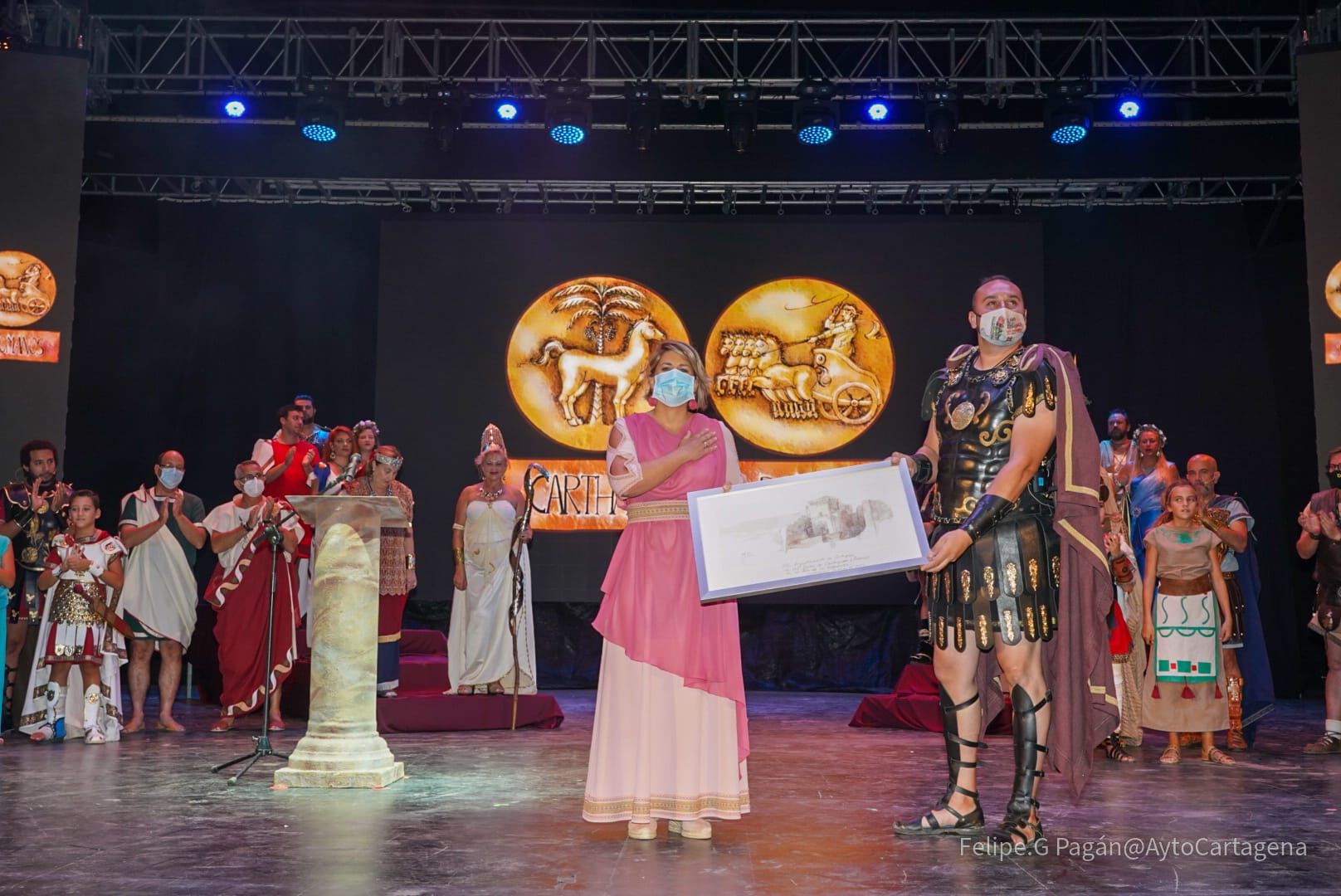 La alcaldesa Noelia Arroyo entrega a Tropas y Legiones una acuarela del pintor de Blanca Pedro Cano, como muestra de gratitud por los esfuerzos de los festeros por mantener viva la llama de la gran fiesta del Mediterráneo