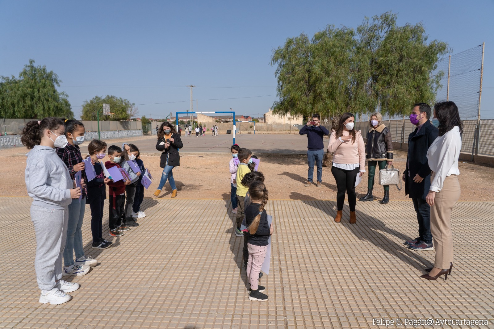 Mª Jesús Martín- Poveda, parte del equipo docente y los escolares y sus familias.