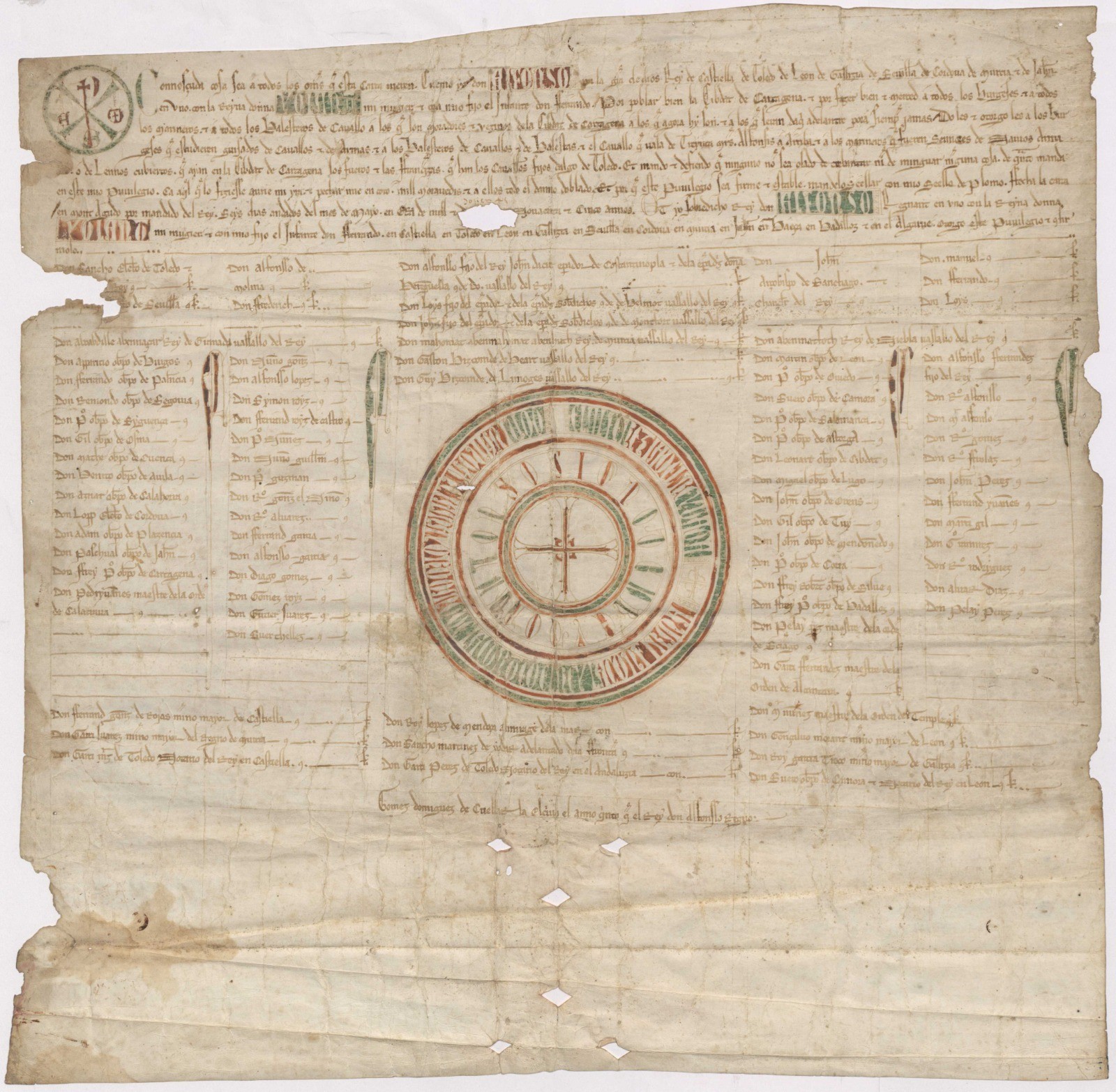 Se trata de un privilegio Rodado, en pergamino, que propicia el asentamiento de caballeros, hidalgos y burgueses en Cartagena, otorgándoles los mismos privilegios que tenían estos en la ciudad de Toledo, pero adaptado a las condiciones específicas de Cartagena,