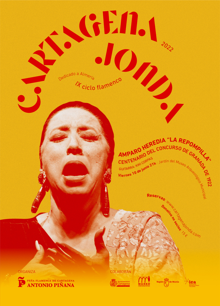 guitarrista Luis Heredia, y sobrina de la Repompa de Málaga cantaora que da nombre a los Tangos de Málaga, tangos de la Repompa. Amparo promulga un recital largo donde se conjugan los tangos de Graná, la taranta y el cante por soleá. A Cartagena viene acompañada por el guitarrista de Pepe Satorre.