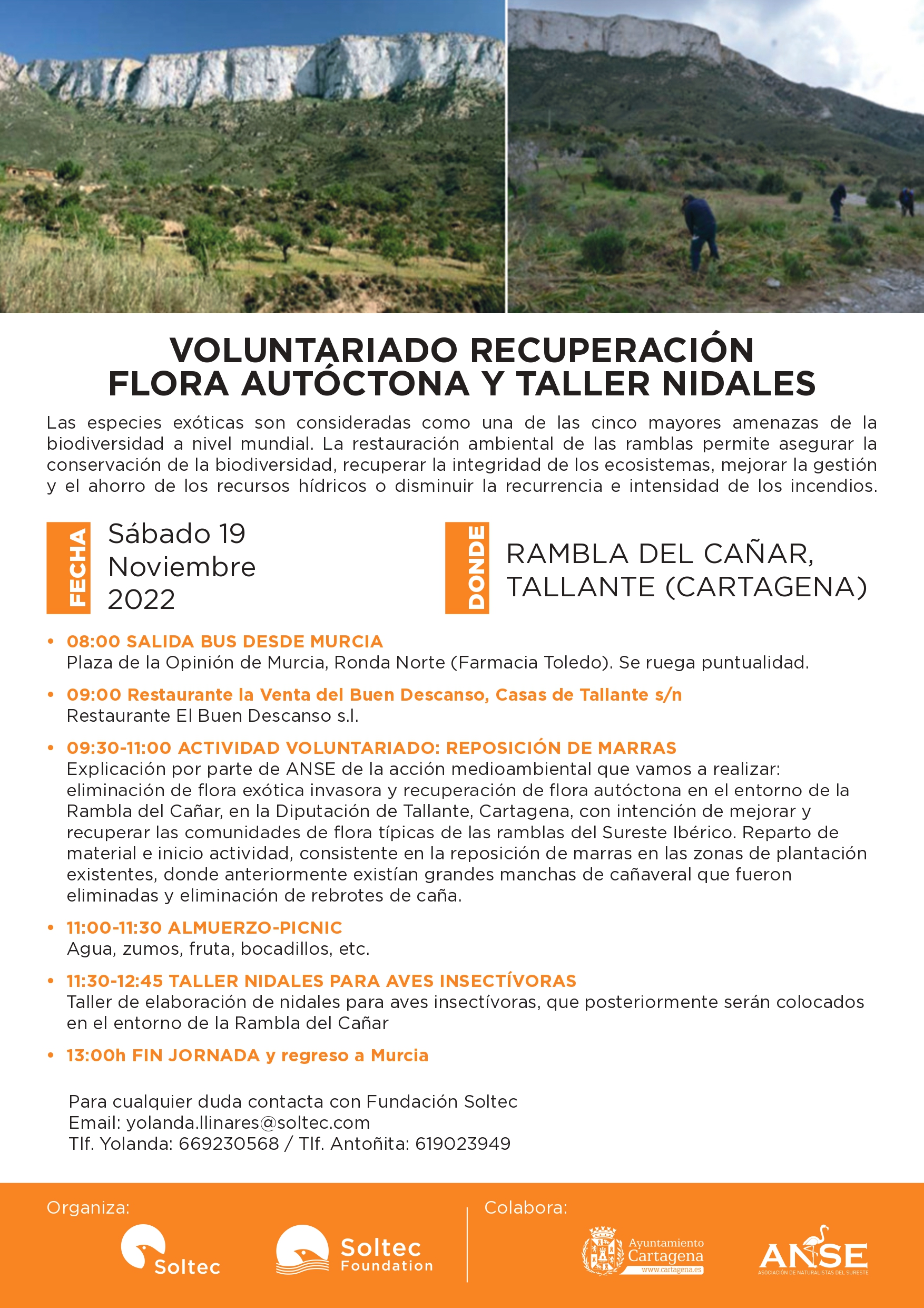 acción de voluntariado medioambiental dentro del festival organizado por el Ayuntamiento de Cartagena. Esta edición se centrará en la recuperación de la flora autóctona y taller de nidos en la rambla del Cañar en Tallante. Será en la mañana de este sábado 19 de noviembre. La acción está abierta.