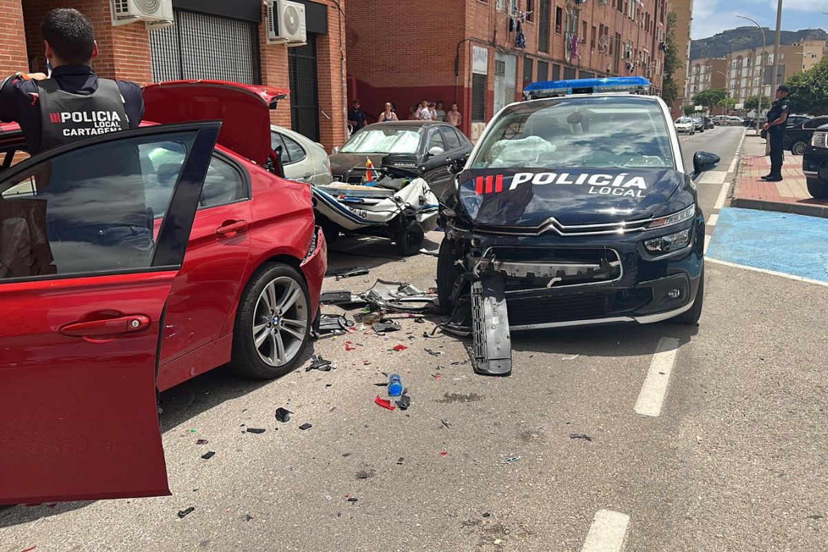 Tras la colisión con otro vehículo, el conductor se ha dado a la fuga, con un paquete bajo el brazo, dejándose en su coche documentación -por lo que ha podido ser identificado-, dinero en efectivo y estupefacientes. Se ha refugiado en un edificio de Nueva Cartagena. Ha habido dos agentes heridos de levedad. Se le sigue buscando.