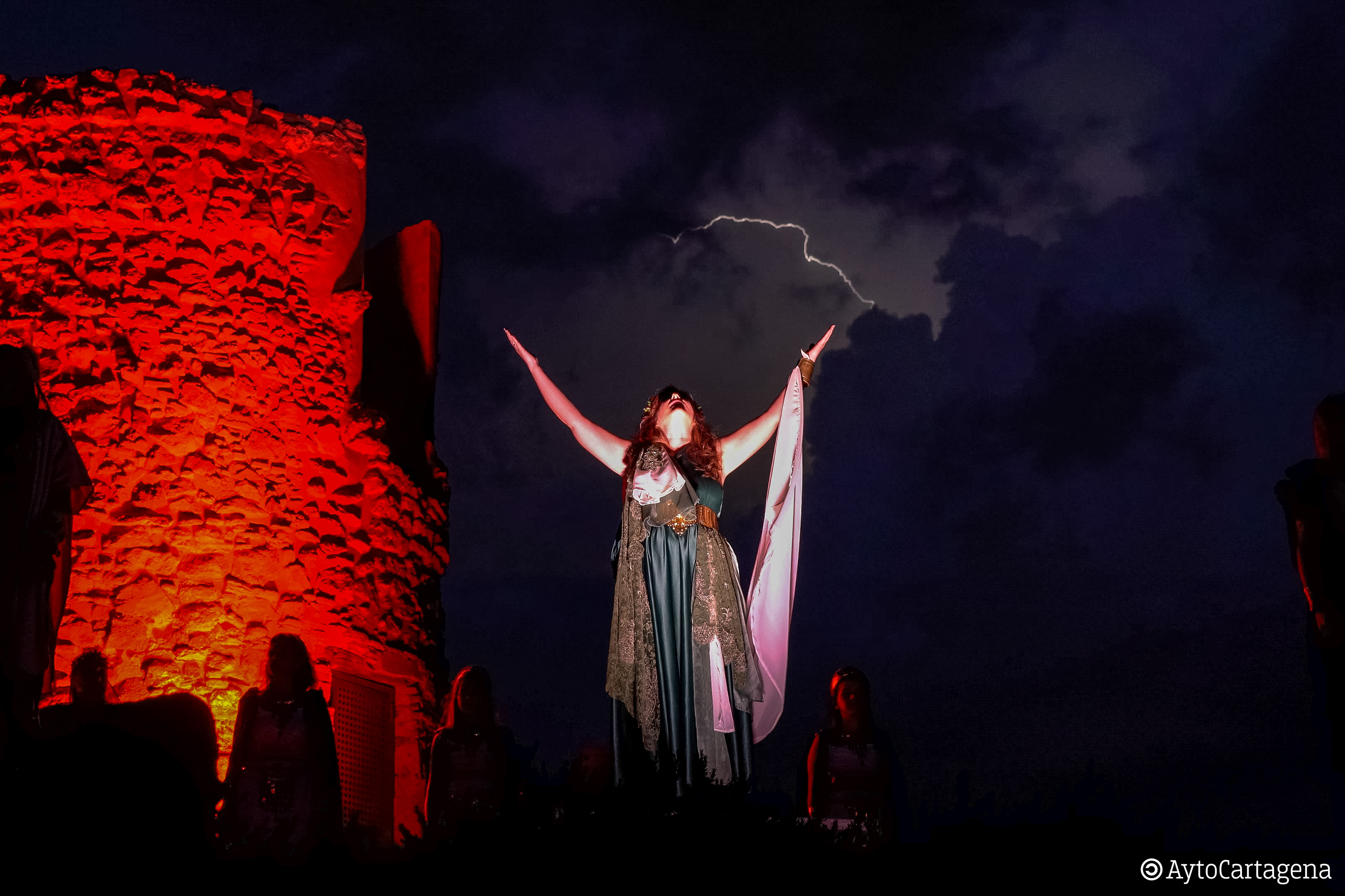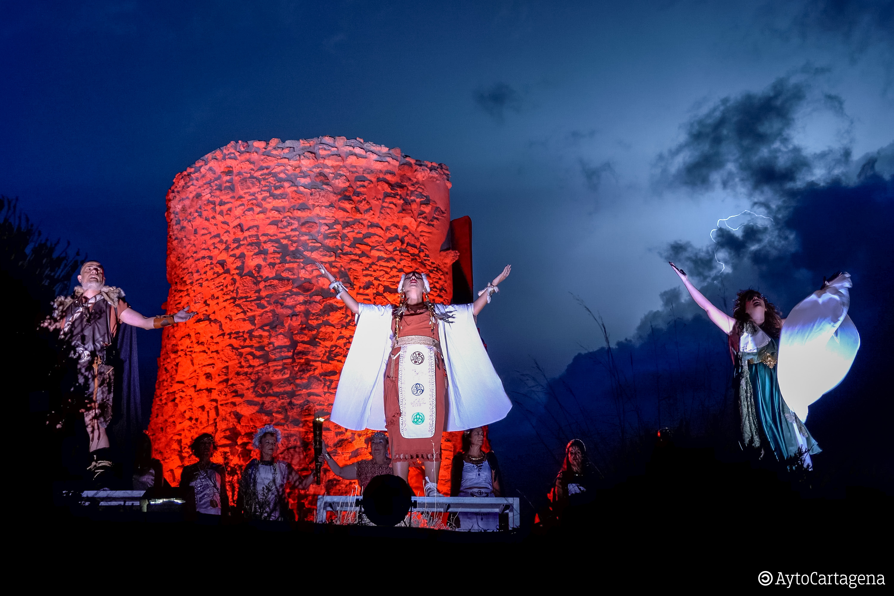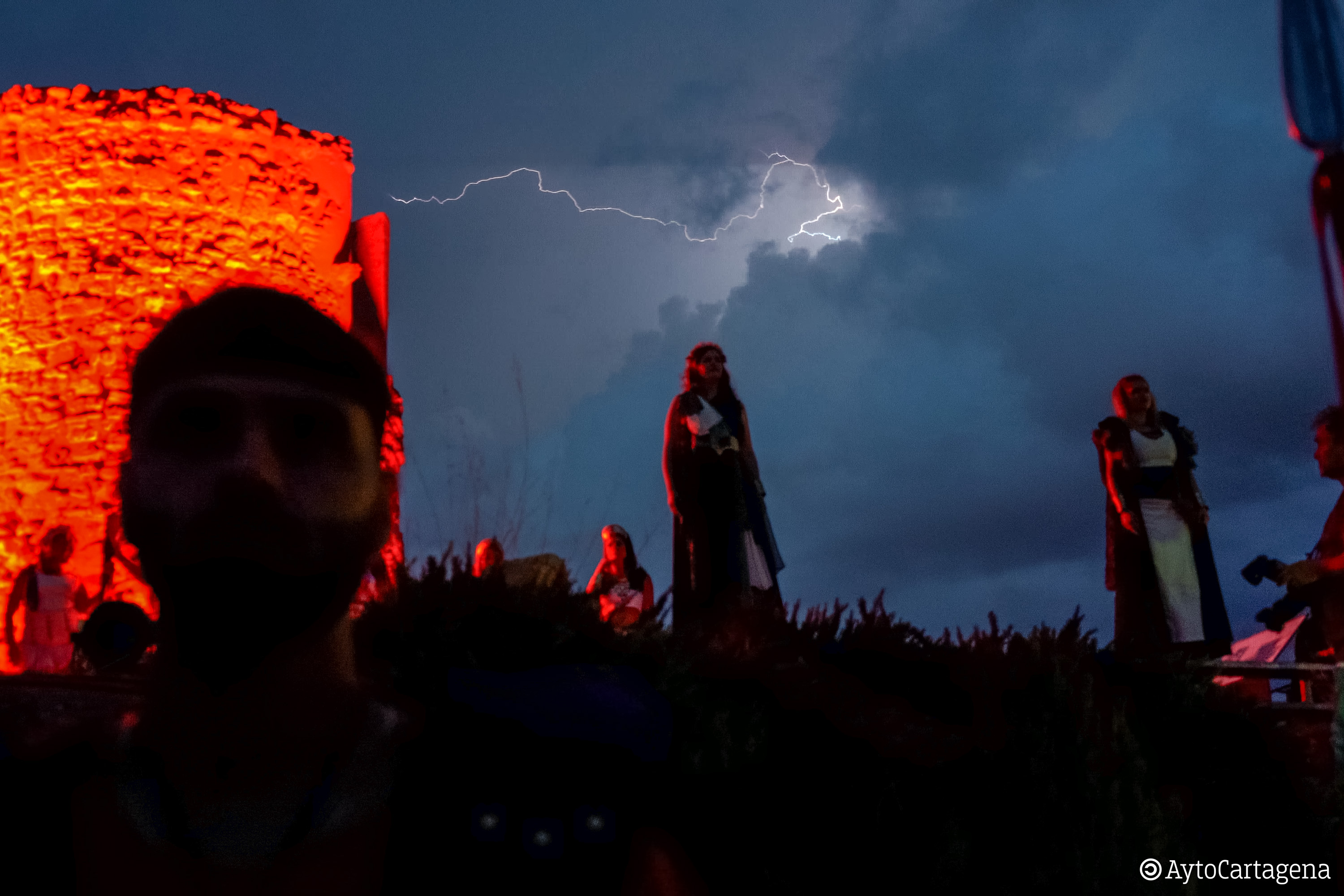 La primera jornada de las fiestas de Carthagineses y Romanos comenzó por la mañana con el traslado del fuego sagrado desde Puerto de Mazarrón a Cartagena, para ser encendida la llama por los festeros al ocaso en el parque arqueológico del cerro del Molinete. Desde allí se divisaban algunos relámpagos en el cielo que no llegaron a convertirse en lluvia, para suerte de tropas y legiones. Tras ello iniciaron la marcha hasta el pregón del Palacio Consistorial haciendo una escala en el Museo del Teatro Romano.
