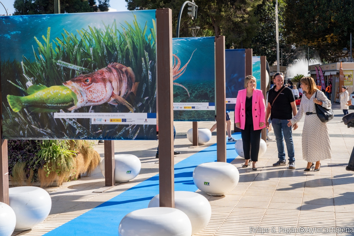 La exposición 'Cartagena, la costa de los tesoros' muestra la fauna marina en la Alameda de San Antón. La colección, obra del autor Javier Murcia, ha sido visitada este viernes, 10 de noviembre, por la alcaldesa Noelia Arroyo y la edil Cristina Mora. Esta exhibición de fotografías de gran formato está organizada por Galpemur con la colaboración del Ayuntamiento de Cartagena.