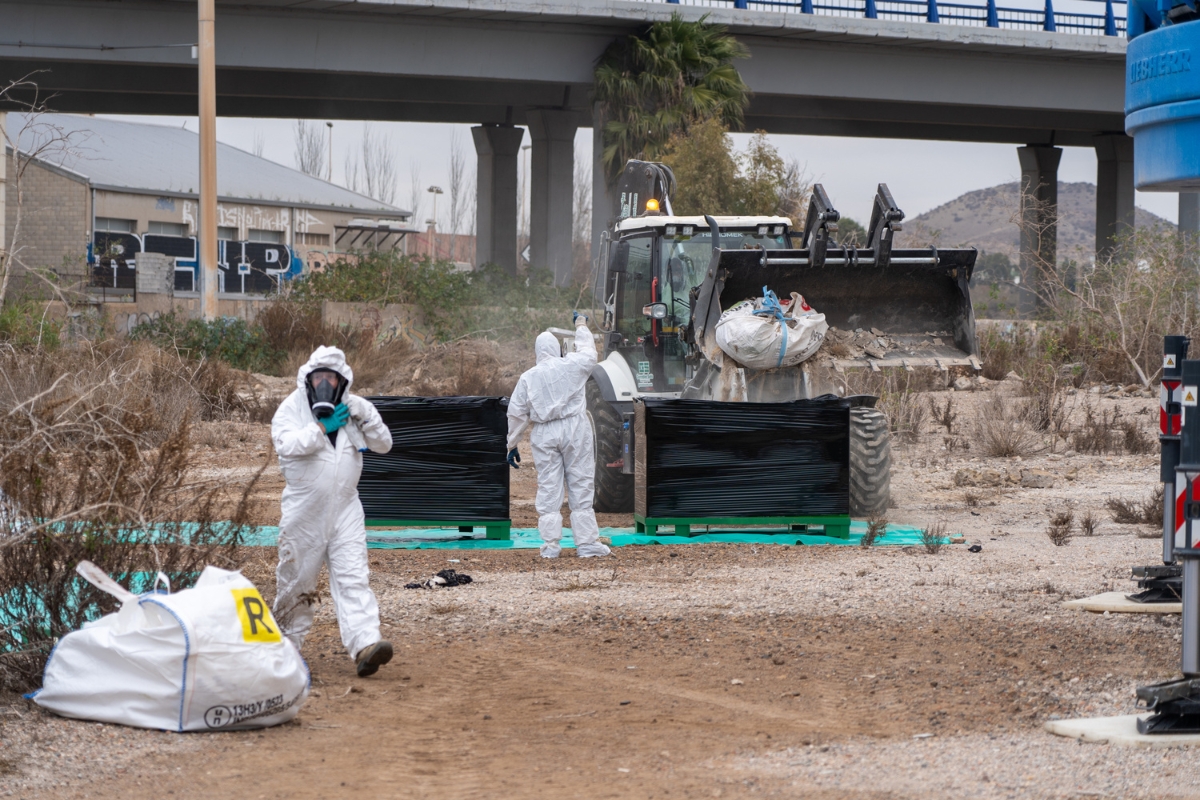 En total, se han retirado alrededor de 50 sacas, de un metro cúbico cada una de ellas. Este material se extrajo con anterioridad de una misma zona, una arqueta de la antigua fábrica de Potasas ubicada entre la autovía A-30 y la carretera de La Unión. La empresa química Ercros es la responsable de la retirada de residuos. En ella también interviene personal de una firma acreditada por el CSN, como Unidad Técnica de Protección Radiológica (UTPR), y de la empresa González Soto.