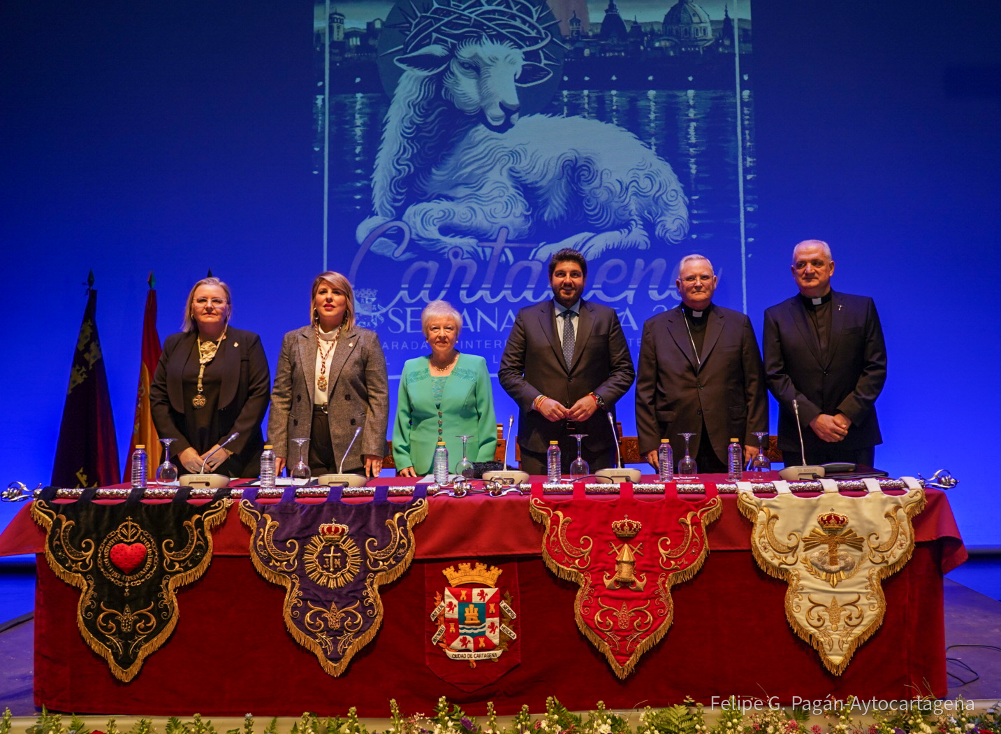 El Auditorio municipal El Batel se convertía este sábado 17 de febrero, en escenario del pregón de la Semana Santa de Cartagena, a cargo de Fernando Gutiérrez Reche, párroco de San Antonio María Claret y capellán de la Cofradía Marraja, protagonista de una emotiva ceremonia presidida como es tradición desde su origen por la Nazarena Mayor de 2024, María Isabel Zamora Fuentes, junto al presidente de la Comunidad Autónoma, Fernando López Miras, la alcaldesa, Noelia Arroyo, el obispo de la Diócesis de Cartagena, José Manuel Lorca Planes y la presidenta de la Junta de Cofradías de la Semana Santa y Hermana Mayor del Resucitado, María Encarnación García Boj.