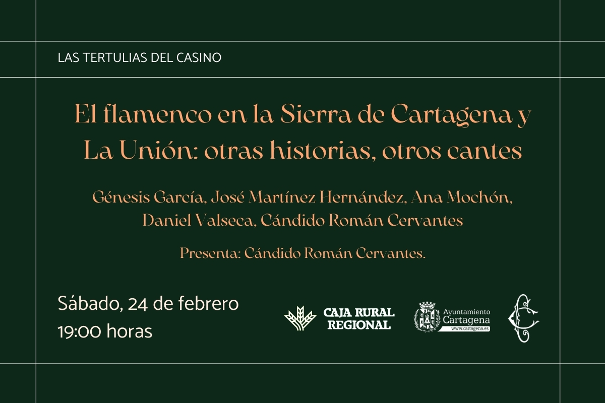 El ciclo Las Tertulias del Casino continuará este sábado 24 de febrero con la tertulia El flamenco en la Sierra de Cartagena y La Unión: otra historia, otros cantes, a las 19:00 horas, en el Casino de Cartagena.