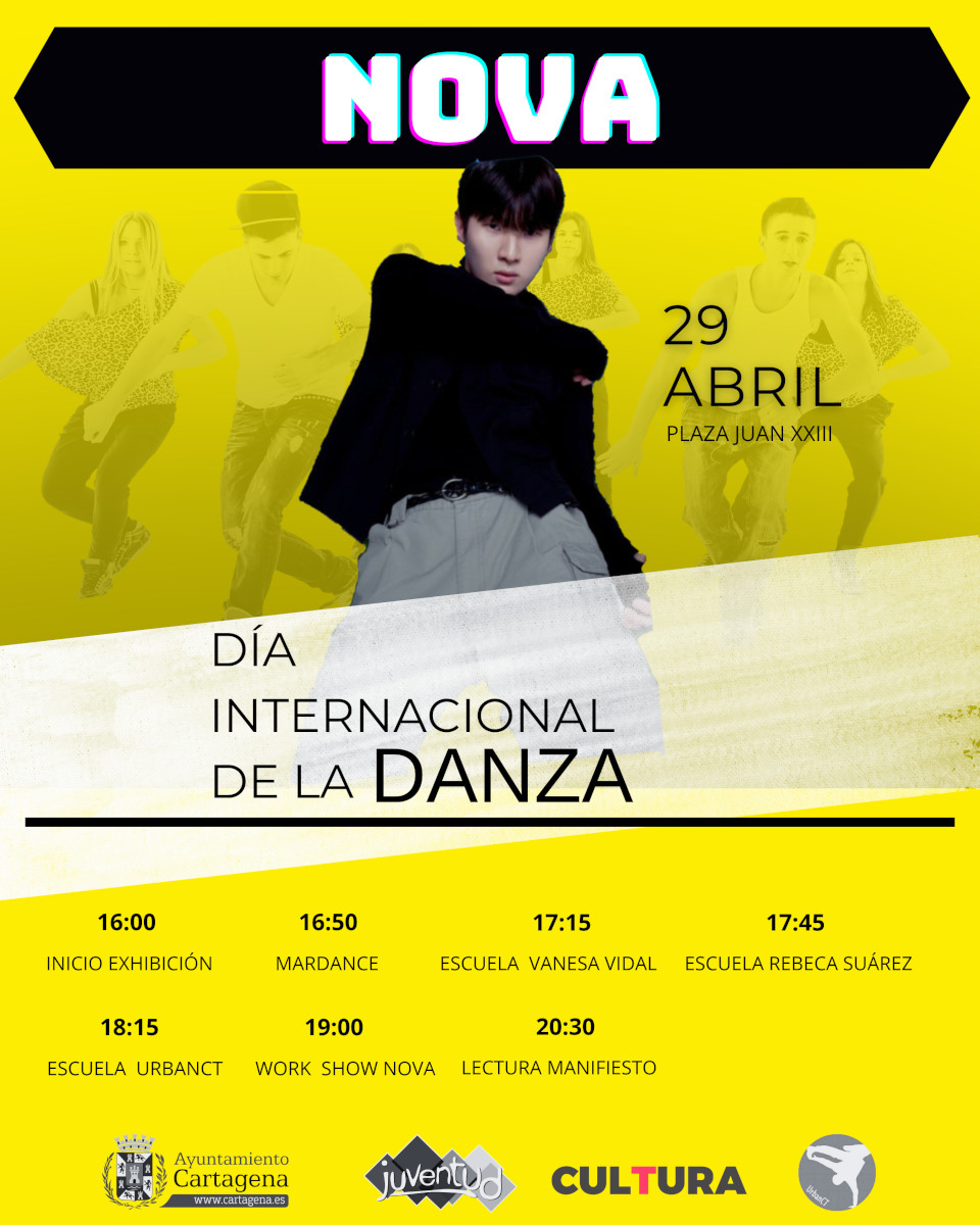 Este año, el Ayuntamiento de Cartagena, en colaboración con un equipo liderado por Gabriel Caravaca, ha organizado un programa para este fin de semana, que incluyen un flashmob que se llevará a cabo el viernes 26, a las 19:00 horas, en la plaza del Icue y concluyendo en la Plaza San Sebastián. Un maratón de exhibiciones de baile el sábado 27, con sesiones de mañana, de 10:30 a 14:00, y tarde, de 16:30 a 20:30 h., con la participación de más de 300 bailarines y 40 coreógrafos de la ciudad. La lectura del manifiesto, a cargo de Eva Atienzar, representante del Consejo juvenil de danza de Cartagena, tendrá lugar, el lunes 29, a las 20:30 horas en el foso de la Plaza Juan XIII, tras la presentación del bailarín y coreógrafo coreano Nova en un evento paralelo creado por la Concejalía de Juventud y Danza Urbana CT.
