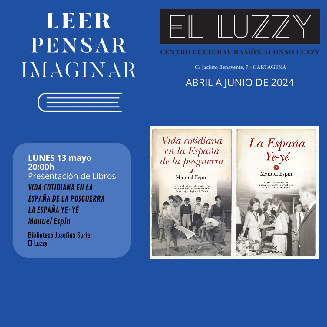 El autor Manuel Espín presentará dos de sus últimas obras, Vida cotidiana en la España de la Posguerra y La España Ye-yé, el próximo lunes 13 de mayo a las 20:00 horas, en la Biblioteca Josefina Soria de El Luzzy. Se trata de un acto incluido en la programación de Leer, Pensar, Imaginar, el programa cultural de la Concejalía de Cultura del Ayuntamiento de Cartagena.