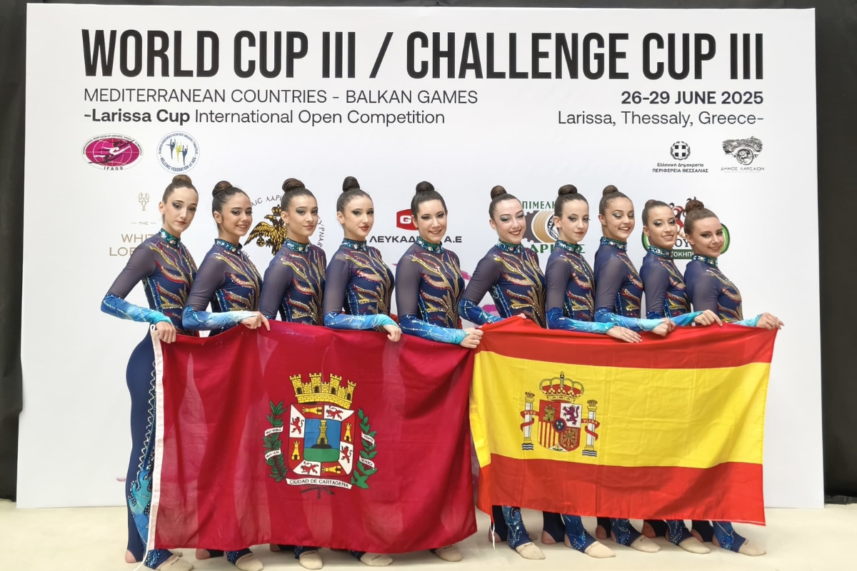 El equipo júnior del Club Rítmica Cartagena participó este fin de semana en la Copa del Mundo de Gimnasia Estética de Grupo y el Campeonato de Países Mediterráneos, celebrados en Larissa, Grecia.
