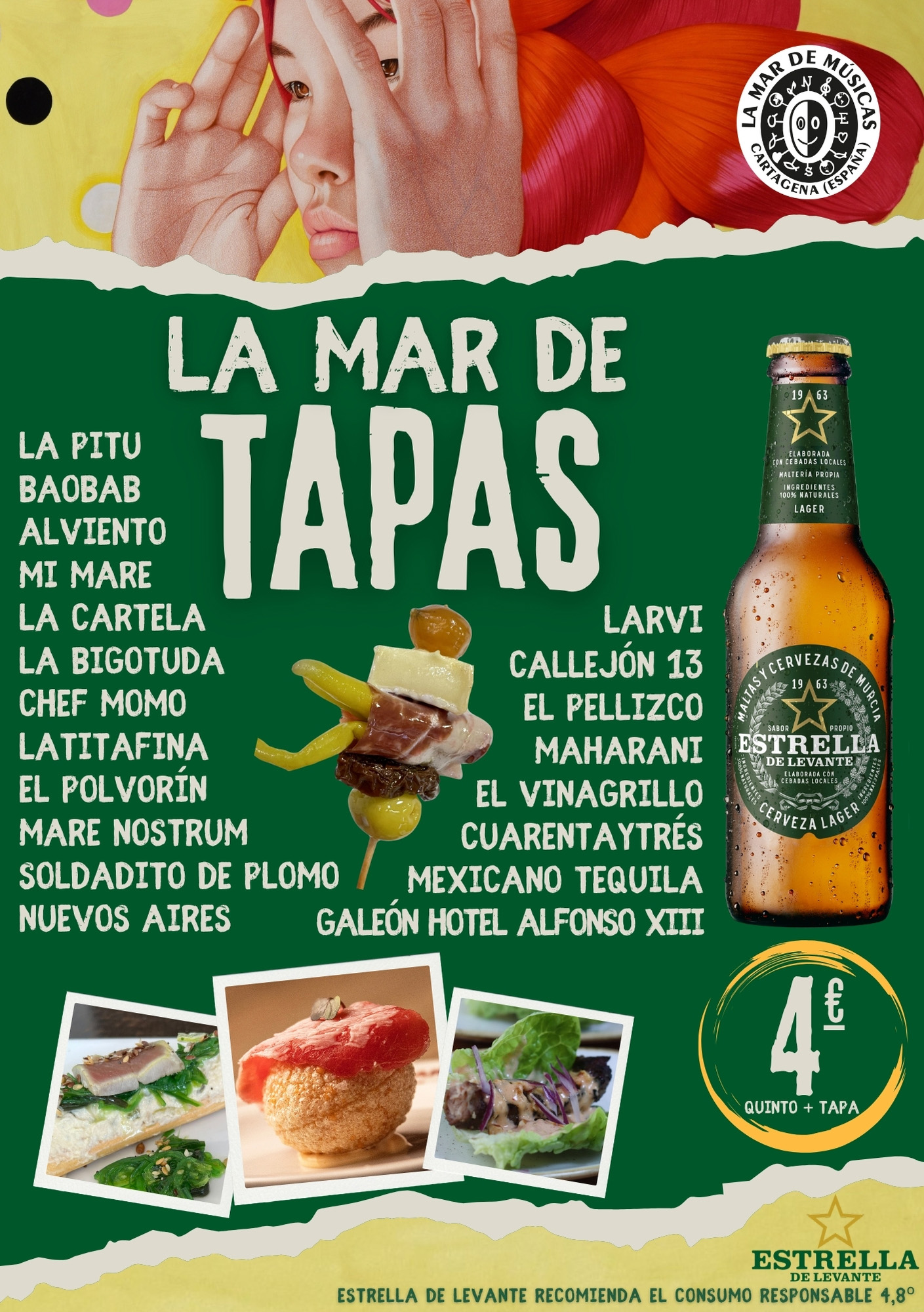 Con motivo del festival La Mar de Músicas, Cartagena ofrece el recorrido gastronómico La Mar de Tapas, una ruta por veinte bares y restaurantes de la ciudad, organizada con el patrocinio de Estrella de Levante. Del 12 al 27 de julio, se podrá disfrutar de una tapa y una cerveza por solo 4 euros, en una experiencia que marida la cocina local con la gastronomía de Corea del Sur, país invitado en esta 30ª edición del festival organizado por el Ayuntamiento de Cartagena.