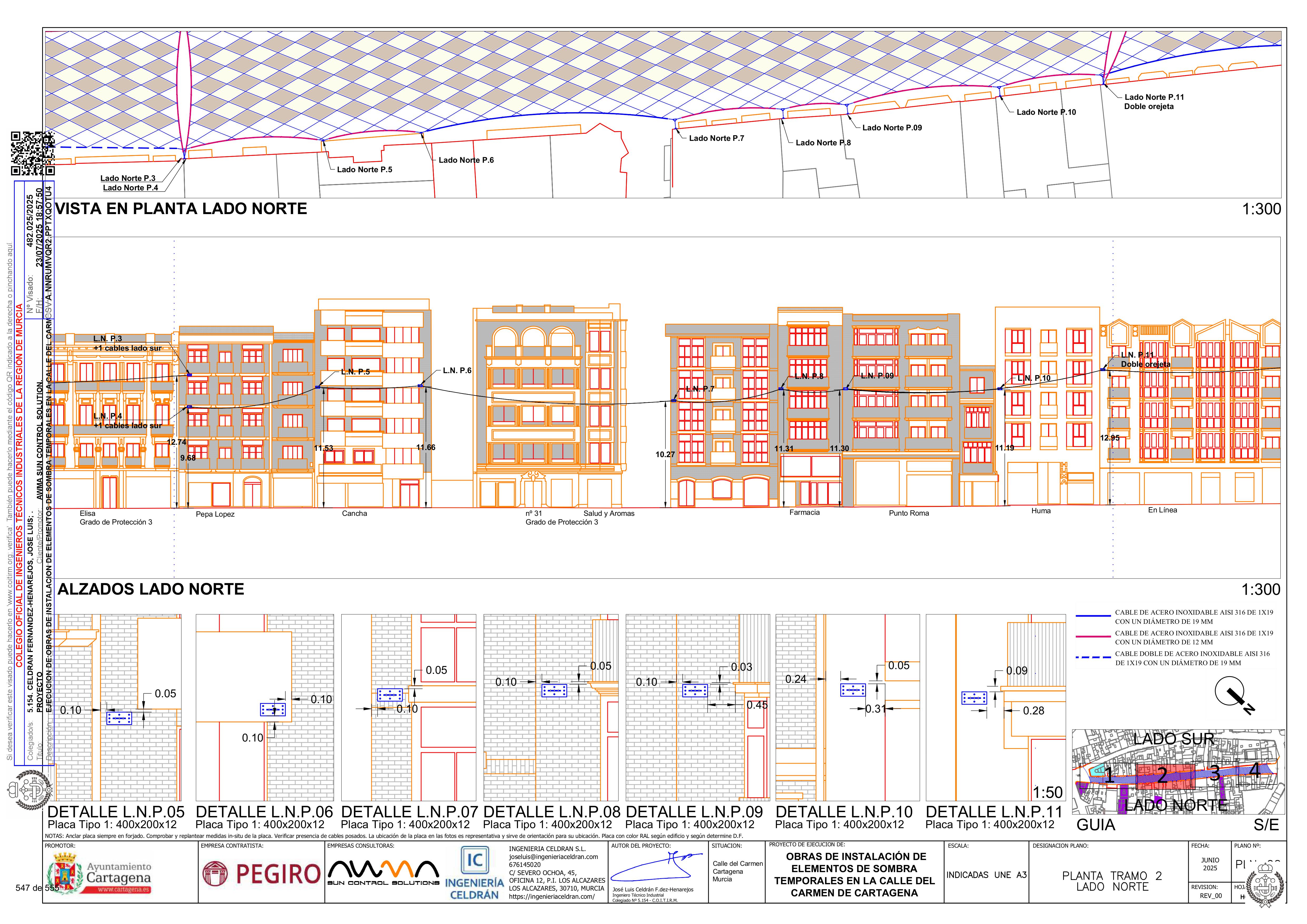 La instalación de los sistemas que darán sombra a la calle del Carmen, dentro del proyecto municipal ‘Teselas’, comenzará este martes con los primeros trabajos de anclaje. Los operarios colocarán los puntos de sujeción en las fachadas no protegidas de la vía y en postes especialmente instalados, siguiendo las indicaciones técnicas definidas por la Universidad Politécnica de Cartagena en el diseño del proyecto. Con este método de fijación se evita intervenir sobre edificios catalogados o con protección patrimonial, garantizando la preservación de las fachadas históricas de esta céntrica calle.