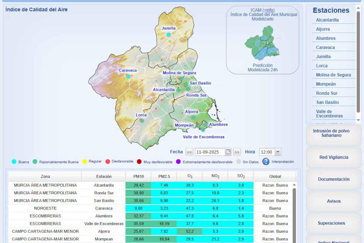 El promedio diario de PM10 de ayer en la estación de La Aljorra fue de 31.29 μg/m3 y el de Mompean fue de 31.96 μg/m3.