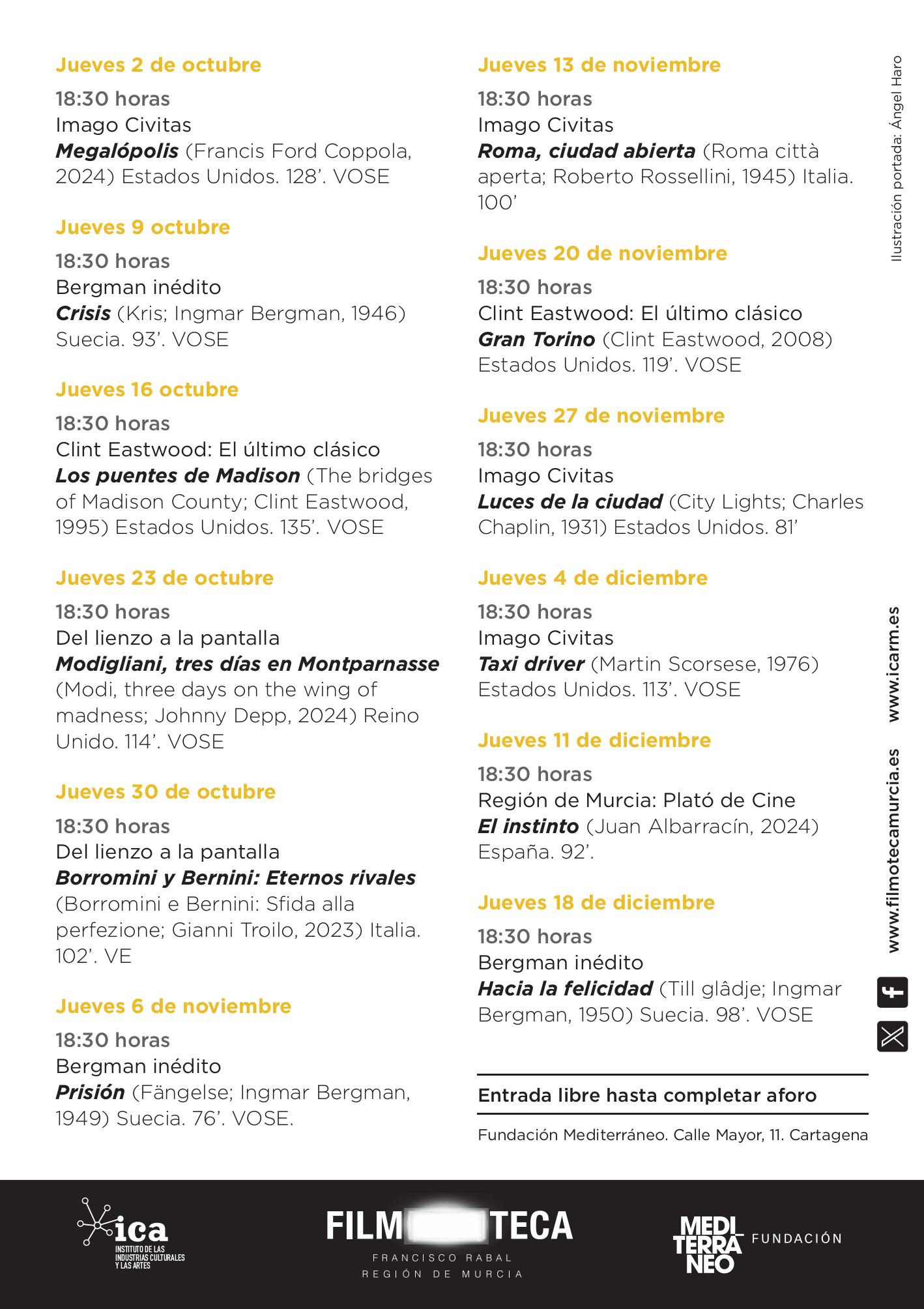 La Filmoteca Regional de Murcia programa un nuevo ciclo trimestral en Cartagena con proyecciones gratuitas en la Fundación Mediterráneo. Los pases se realizan cada jueves de otoño, a las 18:30 horas, con entrada libre, hasta completar aforo.