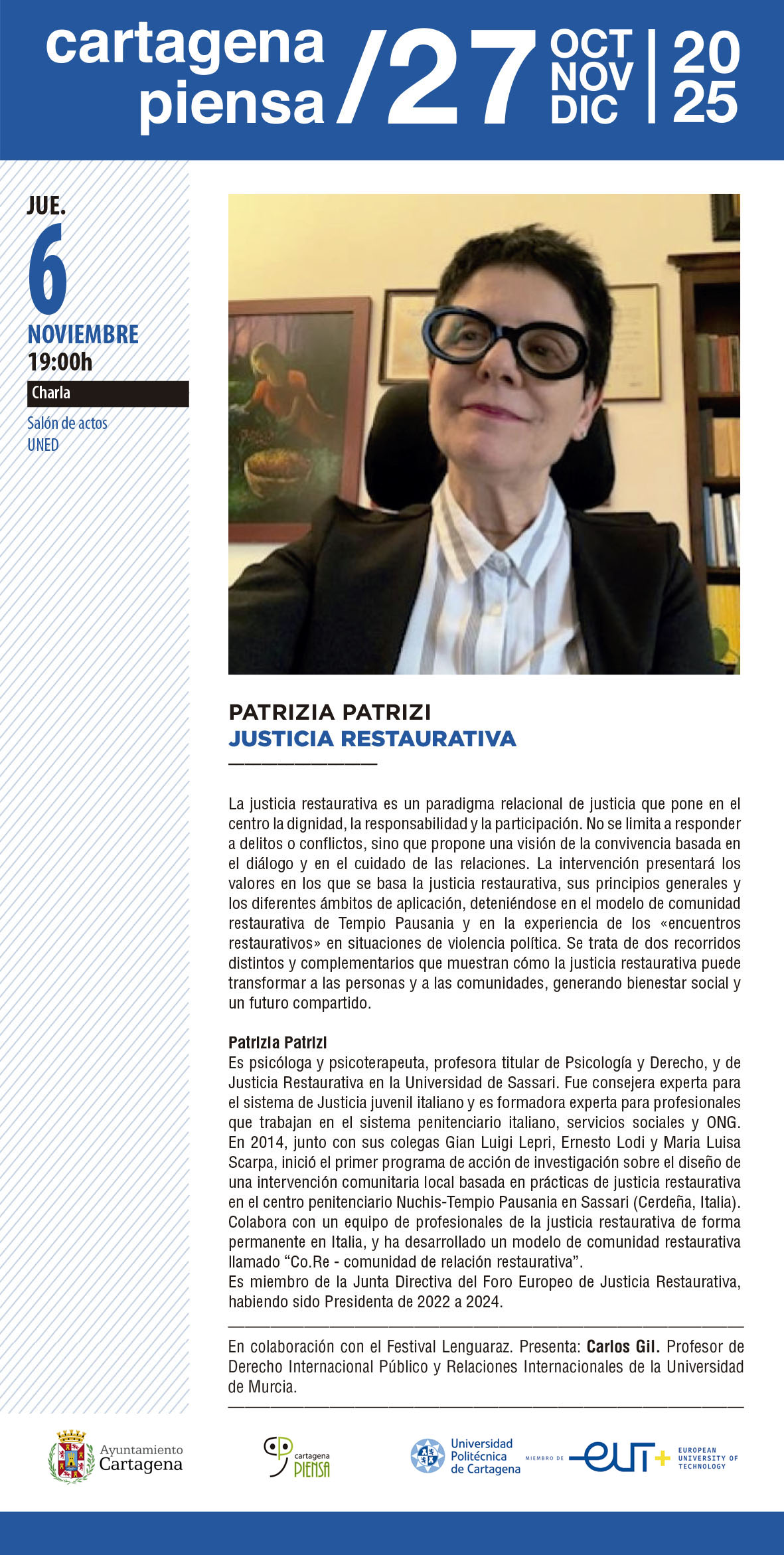 Cartagena Piensa, el programa que sostiene el Ayuntamiento, en colaboración con la UPCT y que desarrolla y programa el grupo promotor, organiza este jueves 6 de noviembre una charla impartida por la psicóloga italiana Patrizia Patrizi sobre la Justicia restaurativa. Arrancará a las 19:00 horas en el salón de actos de la UNED. La entrada es libre, hasta completar aforo.