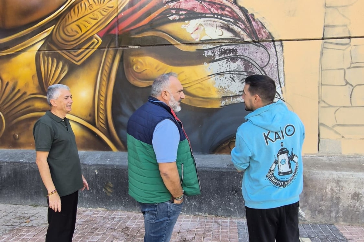 El Ayuntamiento de Cartagena inicia la restauración del mural romano de Canteras de la mano de su creador, el artista urbano Kato. Esta obra ubicada en el pabellón deportivo de Canteras fue premiada en marzo como la mejor del mundo en Street Art Cities. El concejal del Distrito 1, José Ramón Llorca, y el presidente de la Junta Municipal, Juan Felipe García, han visitado este 19 de noviembre al creador para conocer de primera mano el proceso que se llevará a cabo durante los próximos días.