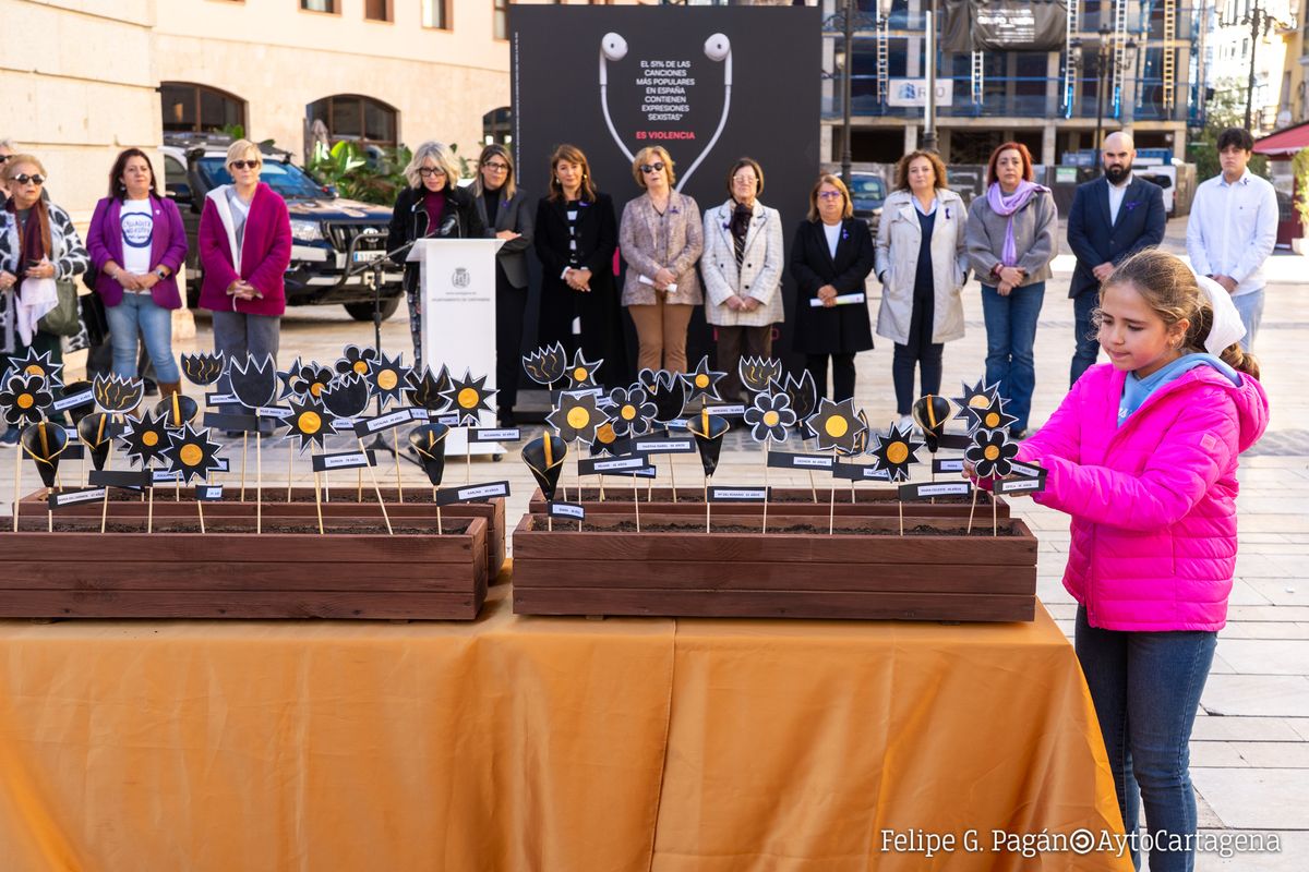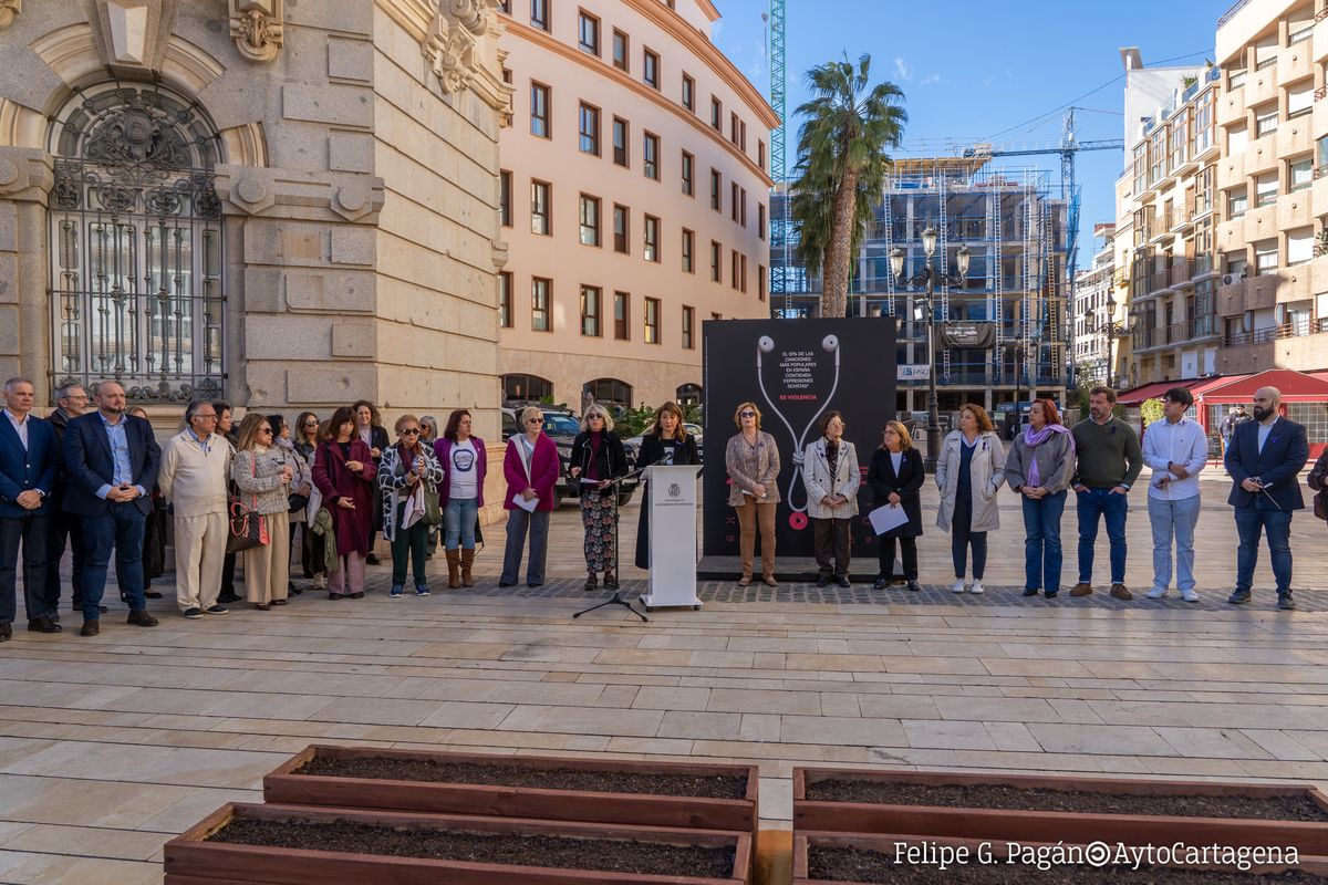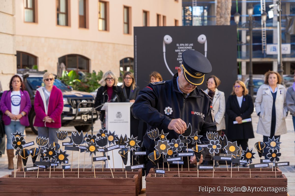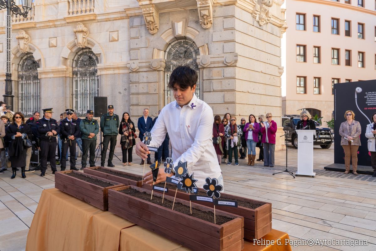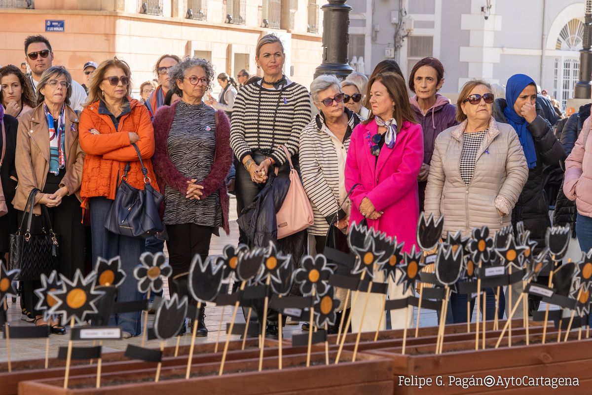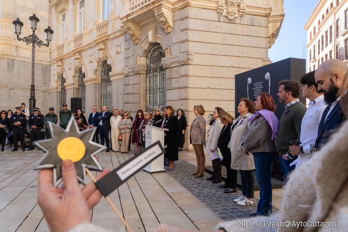 Además de la lectura del manifiesto, un minuto de silencio y la declaración institucional, uno de los momentos más emotivos del acto ha sido el gesto simbólico en recuerdo de las mujeres y niños asesinados en lo que llevamos de año, dos de las víctimas con residencia en Cartagena.