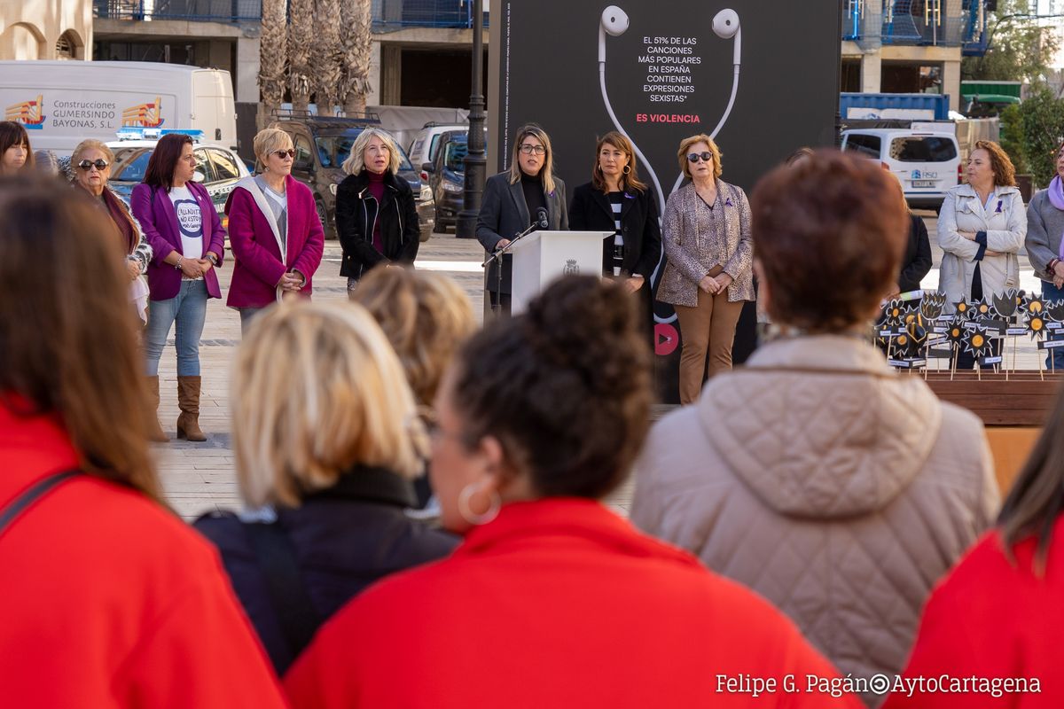 La alcaldesa de Cartagena, Noelia Arroyo, ha presidido este martes el acto conmemorativo con motivo del 25N, Día Internacional de la Eliminación de la Violencia contra la Mujer, en la Plaza del Ayuntamiento. El evento ha contado con la participación de la concejal de Política Social, Igualdad y Familia, Cristina Mora, miembros de la Corporación local, profesionales del área de Igualdad del Ayuntamiento y representantes de numerosos colectivos y asociaciones de mujeres del municipio, que también han participado en la lectura del manifiesto.