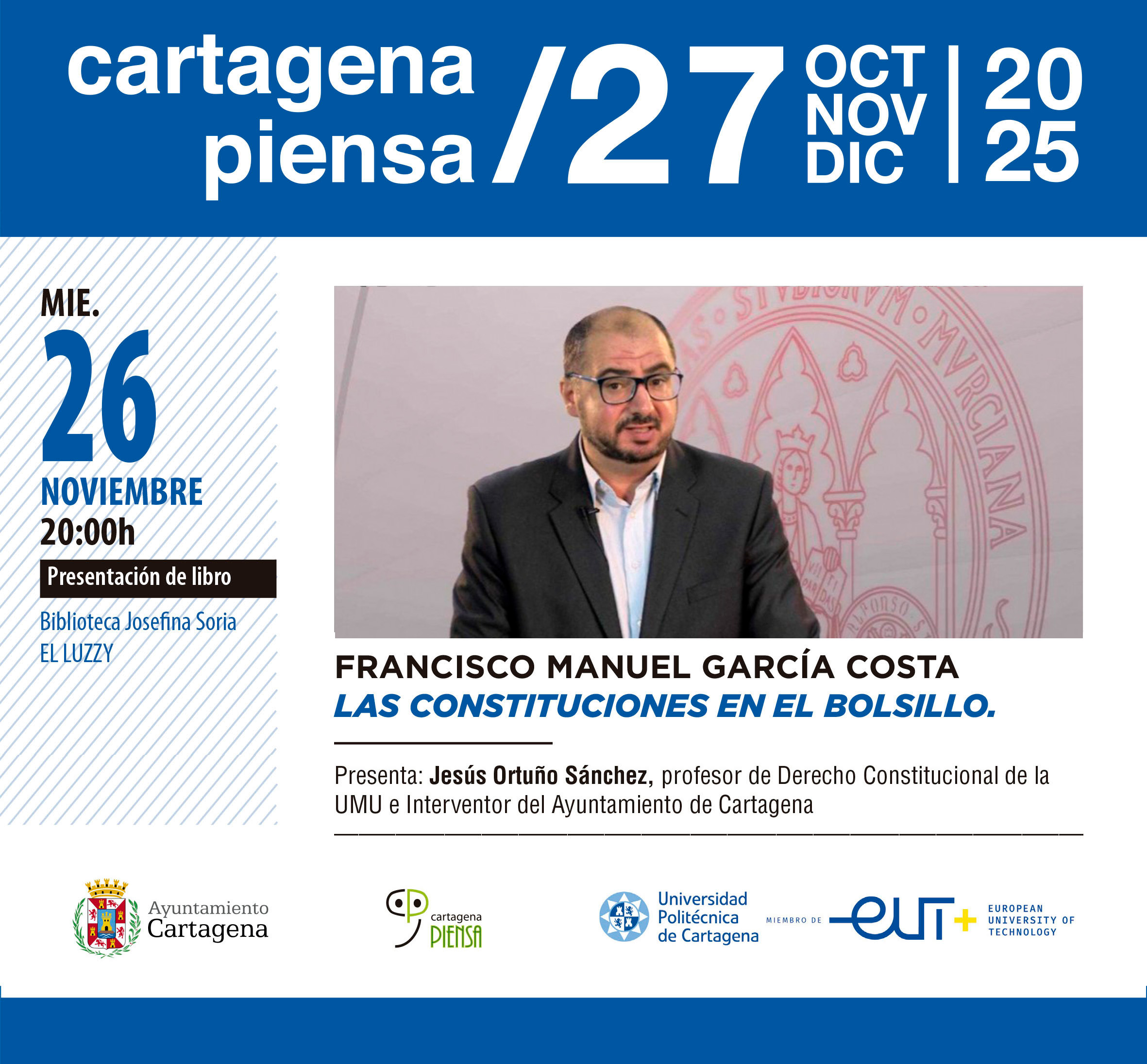 Cartagena Piensa, el programa que sostiene el Ayuntamiento, en colaboración con la UPCT y que desarrolla y programa el grupo promotor, programa miércoles 26 de noviembre la presentación literaria del catedrático Francisco Manuel García Costa, que presentará su obra Las constituciones en el bolsillo. Arrancará a las 20:00 horas en la biblioteca Josefina Soria del Centro Cultural Ramón Alonso Luzzy. La entrada es libre, hasta completar aforo.