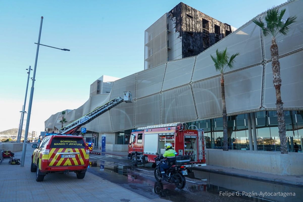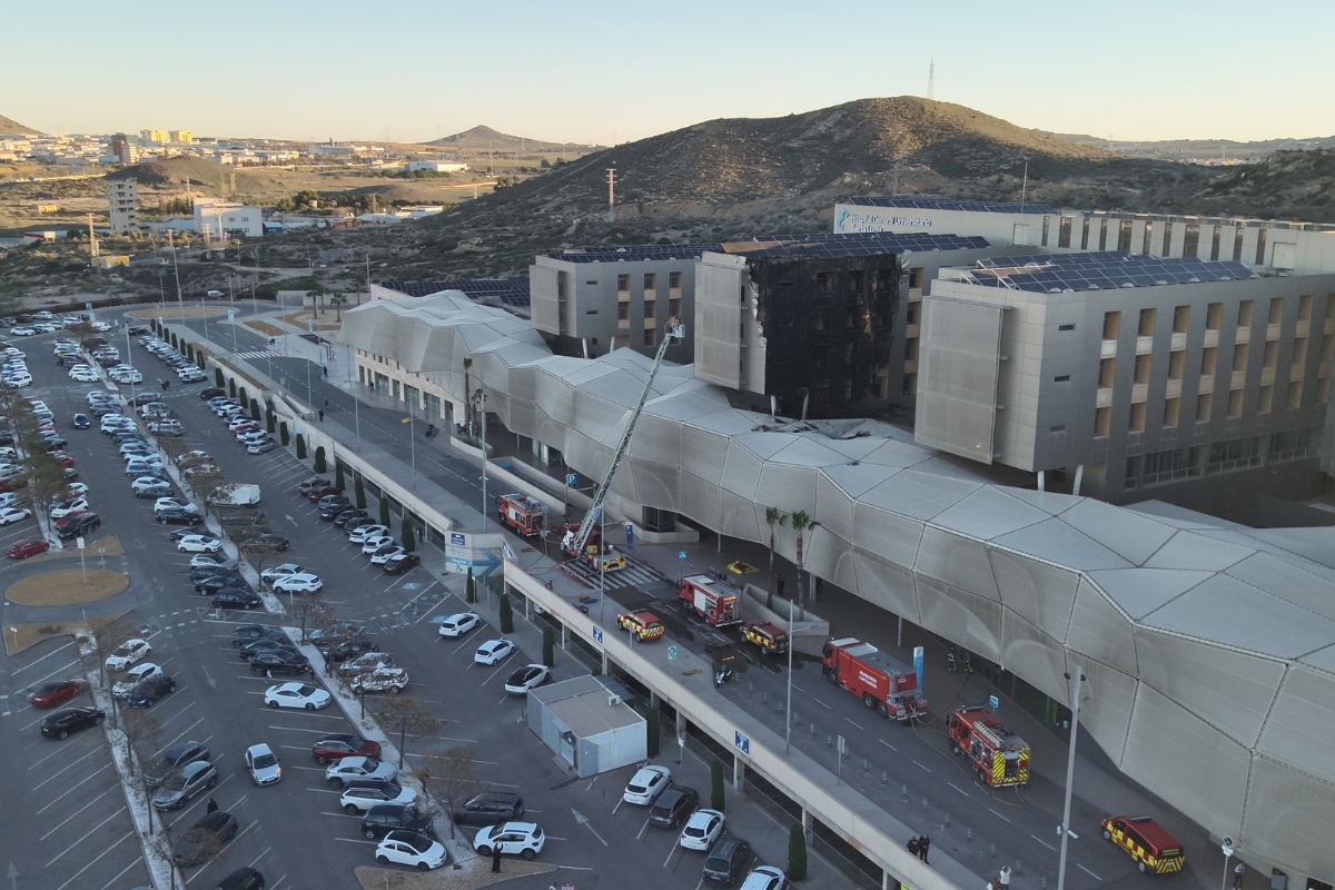 Bomberos extinguen incendio en hospital Santa Lucía de Cartagena. Iniciado a las 7:15 horas de este 26 de noviembre, los efectivos del Ayuntamiento de Cartagena han dado por controlada la situación pasados 20-25 minutos de su intervención, informa la alcaldesa Noelia Arroyo. Desde las 8 de la mañana inspeccionan el interior del área afectada para realizar labores de ventilación, en caso de ser necesarias. También revisan el estado de la fachada.