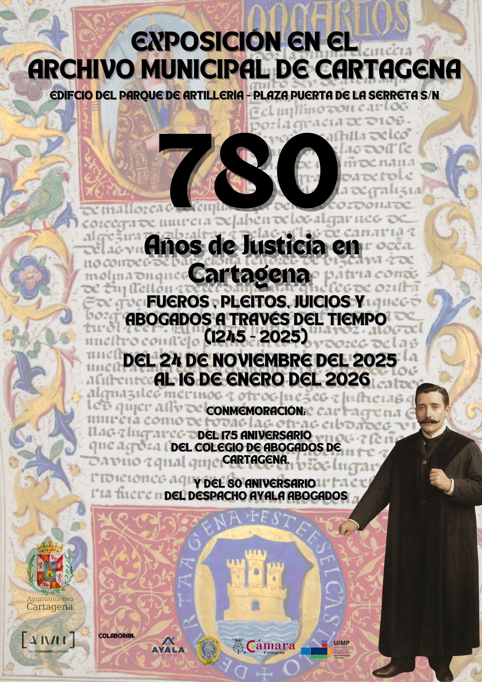 La exposición coincide con el 175 aniversario del Colegio de Abogados de Cartagena y el 80 aniversario del despacho Ayala Abogados, dos efemérides que el Ayuntamiento ha querido asociar a esta mirada de largo plazo sobre la justicia municipal. El contenido reúne piezas que ilustran la actuación de jueces, escribanos, abogados y ciudadanos en la consolidación del sistema jurídico cartagenero, desde la Edad Media hasta el siglo XXI.