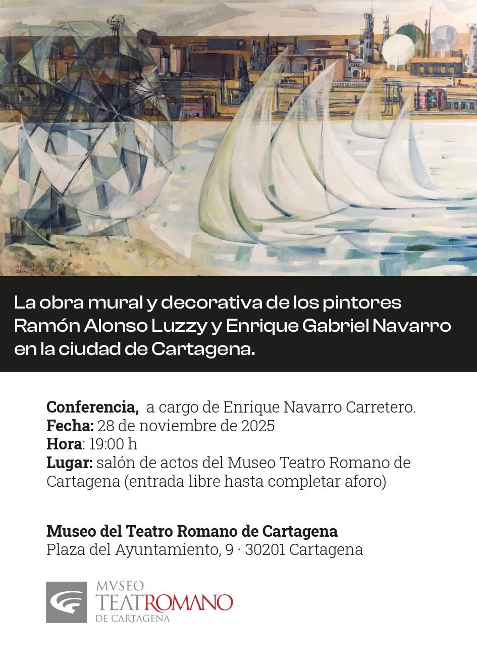 El salón de actos del Museo Teatro Romano Cartagena acoge este viernes 28 de noviembre a las 19:00 horas, la conferencia de Enrique Navarro Carretero sobre la obra mural y decorativa de los artistas Ramón ALonso Luzzy y Enrique Gabriel Navarro en el municipio. Entrada libre, hasta completar aforo.