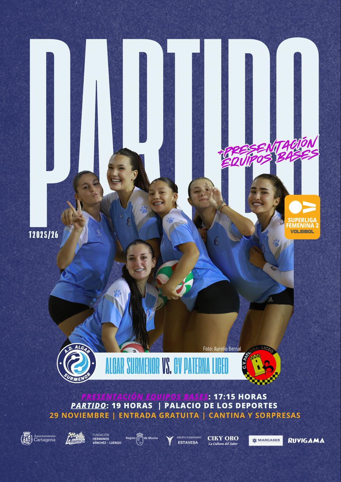 Voleibol. Algar Surmenor Vs CV Paterna Liceo, a las 19:00 horas, en el Palacio de Deportes. Las deportistas del equipo local se enfrentan al conjunto de la Comunidad Valenciana en una nueva jornada de liga. Antes, a las 17:15 horas se realizará la presentación de las escuelas y equipos base del club de Cartagena. Entrada libre, hasta completar aforo.