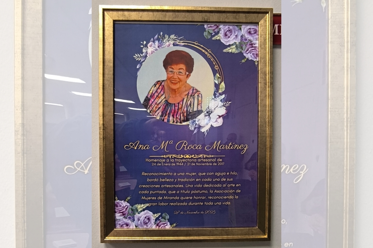 La Asociación de Mujeres de Miranda celebró un emotivo homenaje a Ana María Roca Martínez, conocida como Anita “la bordadora”, con motivo de la inauguración de la exposición Hilos que cuentan historias, que reúne una selección de sus trabajos artesanales. El acto, celebrado en el Centro Social de Miranda, incluyó el descubrimiento de un cuadro conmemorativo por parte de sus hijas, Ana y Paqui, y contó con la presencia de familiares, vecinos y varios representantes municipales.
