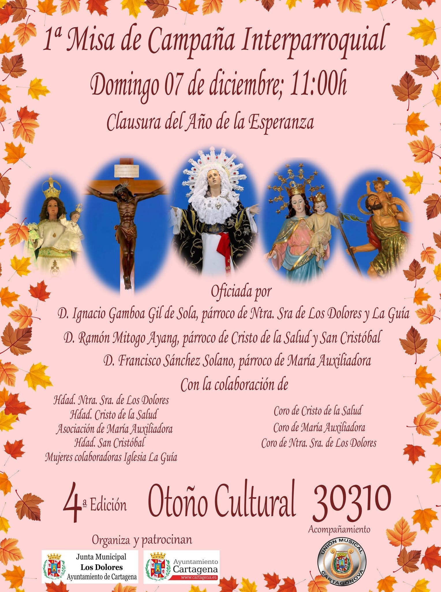 Otoño Cultural de Los Dolores. Misa de Campaña Interparroquial, a las 11:00 horas, en la parroquia de Los Dolores. La Junta Municipal de Los Dolores, con la colaboración del Ayuntamiento, organiza esta iniciativa en la que participan diferentes corales y hermandades del municipio. Más actividades de Otoño Cultural en Los Dolores en el apartado Agenda Ciudad de la web municipal.