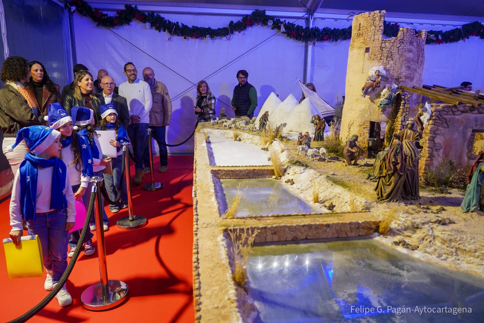 La inauguración oficial del Belén Municipal, en la plaza San Francisco, es otro de los momentos destacados de la apertura de la programación de Navidad en Cartagena. Además, este año lo hace con una nueva estructura, donde la escena más llamativa es la escenografía del Portal, recreada al abrigo de un molino salinero sobre una reproducción a escala de las Salinas de Marchamalo.