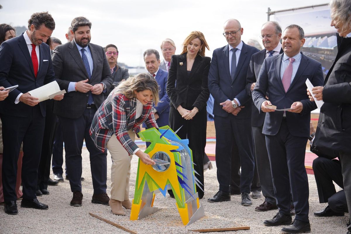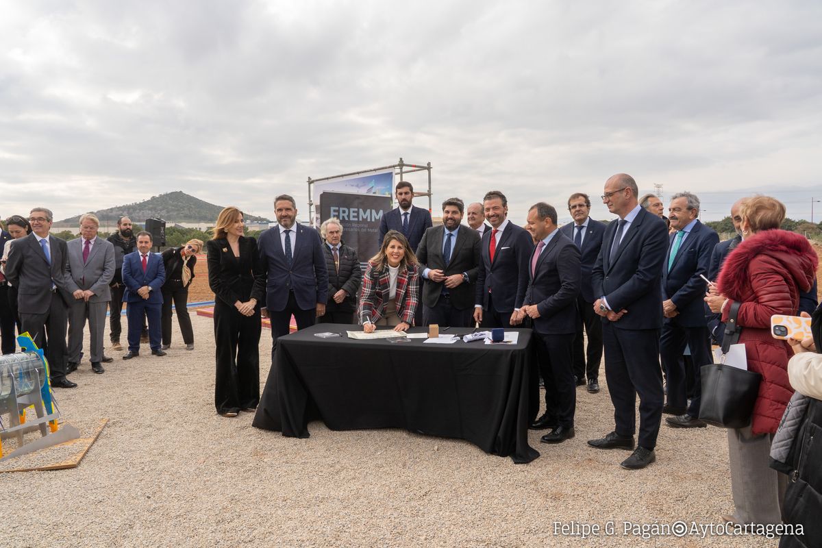 La alcaldesa de Cartagena, Noelia Arroyo, junto al presidente de la Comunidad Autónoma, Fernando López Miras, ha presidido este jueves 11 de diciembre el acto de colocación de la primera piedra del Centro de Capacitación Industrial, Naval, Náutico y de Transformación Tecnológica que la Federación Regional de Empresarios del Metal de Murcia (FREMM) construirá en el polígono industrial de Los Camachos. Con un presupuesto global superior a los 11 millones de euros, este centro se perfila como una infraestructura clave para la formación especializada en sectores estratégicos como el metal, la defensa, la automatización y las energías renovables, ya que contará con un aula pionera en hidrógeno verde.