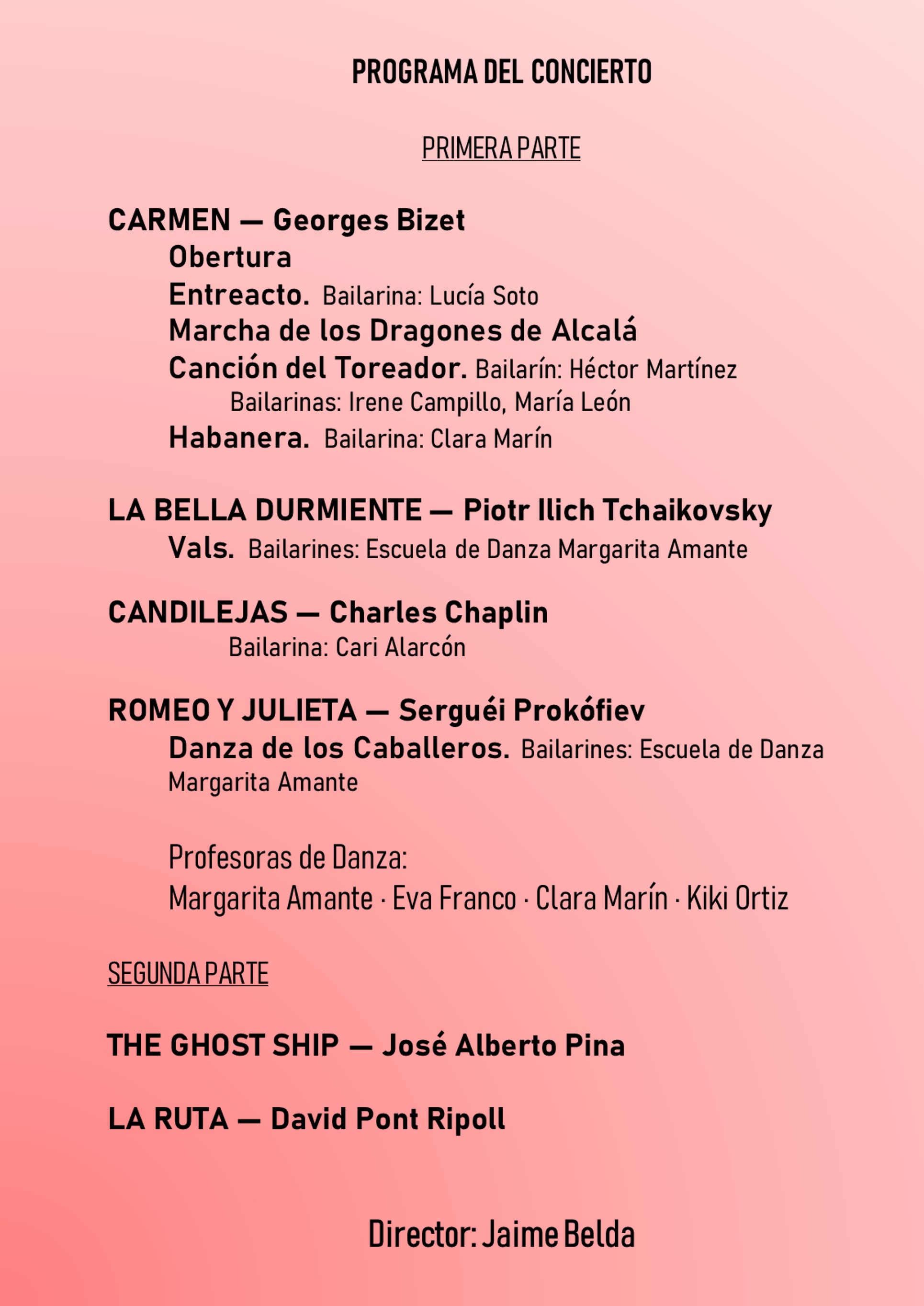 El programa estará dividido en dos partes: en la primera, la banda actuará junto a la Escuela de Danza y Movimiento Margarita Amante, integrando música y coreografías sobre el escenario; en la segunda parte, la Unión Musical Cartagonova interpretará diferentes piezas en solitario.